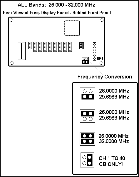 Once you have the jumper(s) in place, You must reset the microprocessor by turning the power switch Off. The unit will resume the new frequency range as soon as the power switch is turned on again. |