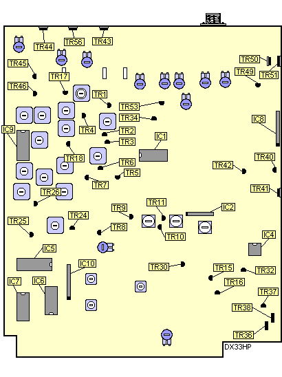 TR 1......NB Amp TR 2......NB Amp TR 3......NB Amp TR 4......NB AGC TR 5......NB Pulse Amp TR 6......NB Pulse Amp TR 7......NB Shunt Switch TR 8......2nd RX Mixer TR 9......AM/FM IF Amp TR 10....AM/FM IF Amp TR 11....AM/FM IF Amp TR 15....AF Preamp TR 16....Squelch Switch TR 17....RX RF Amp TR 18....1st RX Mixer TR 19....1st IF Amp TR 23....AM Det. Switch TR 24....PLL Ref. Osc. TR 25....VCO TR 26....VCO Buffer TR 30....Carrier Osc. TR 32....AMC Shunt TR 34....AMC/ALC Amp TR 36....RX Voltage Switch TR 37....RX Voltage Switch TR 38....TX Voltage Switch TR 40....Voltage Reg. TR 41....Voltage Reg. TR 42....AF Preamp TR 43....RF Final Amp TR 44....RF Driver Amp TR 45....RF Predriver Amp TR 46....RF Amp And Buffer TR 49....AM Mod. Amp TR 50....AM Mod. Amp TR 51....AM Mod. Amp
