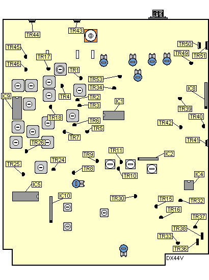 TR 1......NB Amp TR 2......NB Amp TR 3......NB Amp TR 4......NB AGC TR 5......NB Pulse Amp TR 6......NB Pulse Amp TR 7......NB Shunt Switch TR 8......2nd RX Mixer TR 9......AM/FM IF Amp TR 10....AM/FM IF Amp TR 11....AM/FM IF Amp TR 15....AF Preamp TR 16....Squelch Switch TR 17....RX RF Amp TR 18....1st RX Mixer TR 19....1st IF Amp TR 23....AM Det. Switch TR 24....PLL Ref. Osc. TR 25....VCO TR 26....VCO Buffer TR 30....Carrier Osc. TR 32....AMC Shunt TR 34....AMC/ALC Amp TR 36....RX Voltage Switch TR 37....RX Voltage Switch TR 38....TX Voltage Switch TR 40....Voltage Reg. TR 41....Voltage Reg. TR 42....AF Preamp TR 43....RF Final Amp TR 44....RF Driver Amp TR 45....RF Predriver Amp TR 46....RF Amp And Buffer TR 49....AM Mod. Amp TR 50....AM Mod. Amp TR 51....AM Mod. Amp TR 53....AMC Amp |