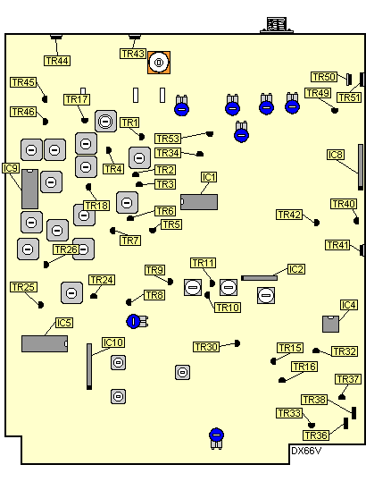 TR 1......NB Amp TR 2......NB Amp TR 3......NB Amp TR 4......NB AGC TR 5......NB Pulse Amp TR 6......NB Pulse Amp TR 7......NB Shunt Switch TR 8......2nd RX Mixer TR 9......AM/FM IF Amp TR 10....AM/FM IF Amp TR 11....AM/FM IF Amp TR 15....AF Preamp TR 16....Squelch Switch TR 17....RX RF Amp TR 18....1st RX Mixer TR 19....1st IF Amp TR 23....AM Det. Switch TR 24....PLL Ref. Osc. TR 25....VCO TR 26....VCO Buffer TR 30....Carrier Osc. TR 32....AMC Shunt TR 34....AMC/ALC Amp TR 36....RX Voltage Switch TR 37....RX Voltage Switch TR 38....TX Voltage Switch TR 40....Voltage Reg. TR 41....Voltage Reg. TR 42....AF Preamp TR 43....RF Final Amp TR 44....RF Driver Amp TR 45....RF Predriver Amp TR 46....RF Amp And Buffer TR 49....AM Mod. Amp TR 50....AM Mod. Amp TR 51....AM Mod. Amp TR 53....AMC Amp |