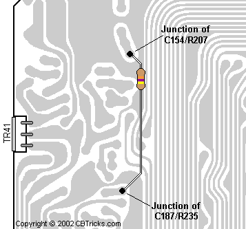 Talkback can become distorted if these radios have been "peaked," and there is no cure because the talkback just amplifies what goes to the RF section. Try adding a 470k ohm resistor from junction of C154/R207 to the junction of C187/R235 on the solder side of the board. This will also give you clean talkback on SSB and FM. Try different values of resistance to get the amount of volume you want. The less the resistance the louder the talkback will be. |