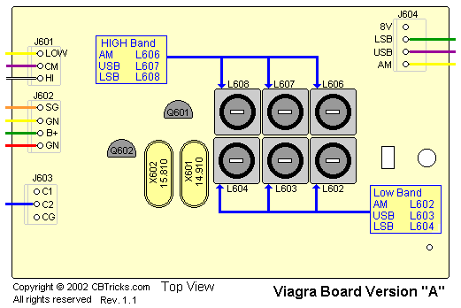 10. The Viagra A PCB were designed to use the OFF/ANL/ANL+NB switch by plugging into J6 on the main pcb. Some folks use the tone switch (HI/MED/LOW) on the front panel or you can mount a center switch in the radio.