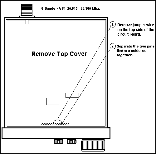 | 1. | Remove the top cover from the unit and locate the row of 15 pins across the front of the unit. Unsolder the short jumper wire from the 7th. pin to pins 11 and 12 (connected together). |