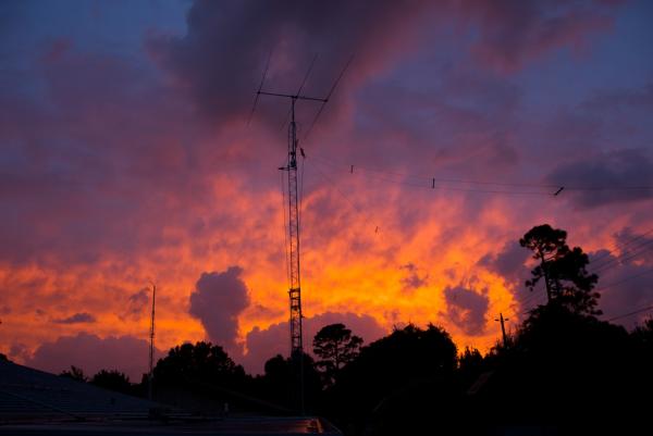 3 Element hairpin matched 10 Meter Yagi @ 18.5 Meters (60 ft.) with 40 & 80 Meter Dipoles, Telex Hy-Gain T2X Tail Twister Rotator, mounted on an E Z Way Crank up, Tilt over tower at 18.5 Meters (60 ft.) at sundown