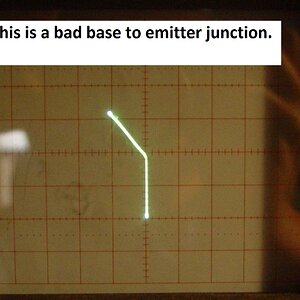 Those oscilloscope traces are on brand new never installed transistors. The perfect right angle traces are typical base collector patterns. That trace looked the same on every transistor including the ones showing base emitter shorts.