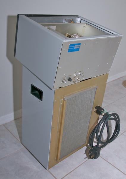 Rear view, 240V power cord, air filter for the forced air cooling of the power supply and Eimac ceramic RF tube