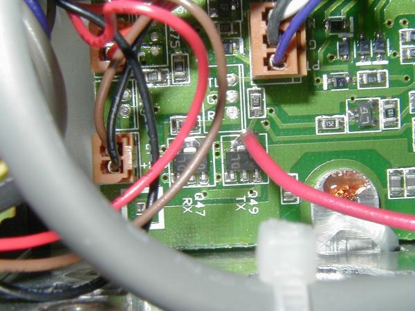 red wire- here is the red wire, soldered to the collector of Q49. The collector is the single leg of Q49, the opposite side has 3 legs.