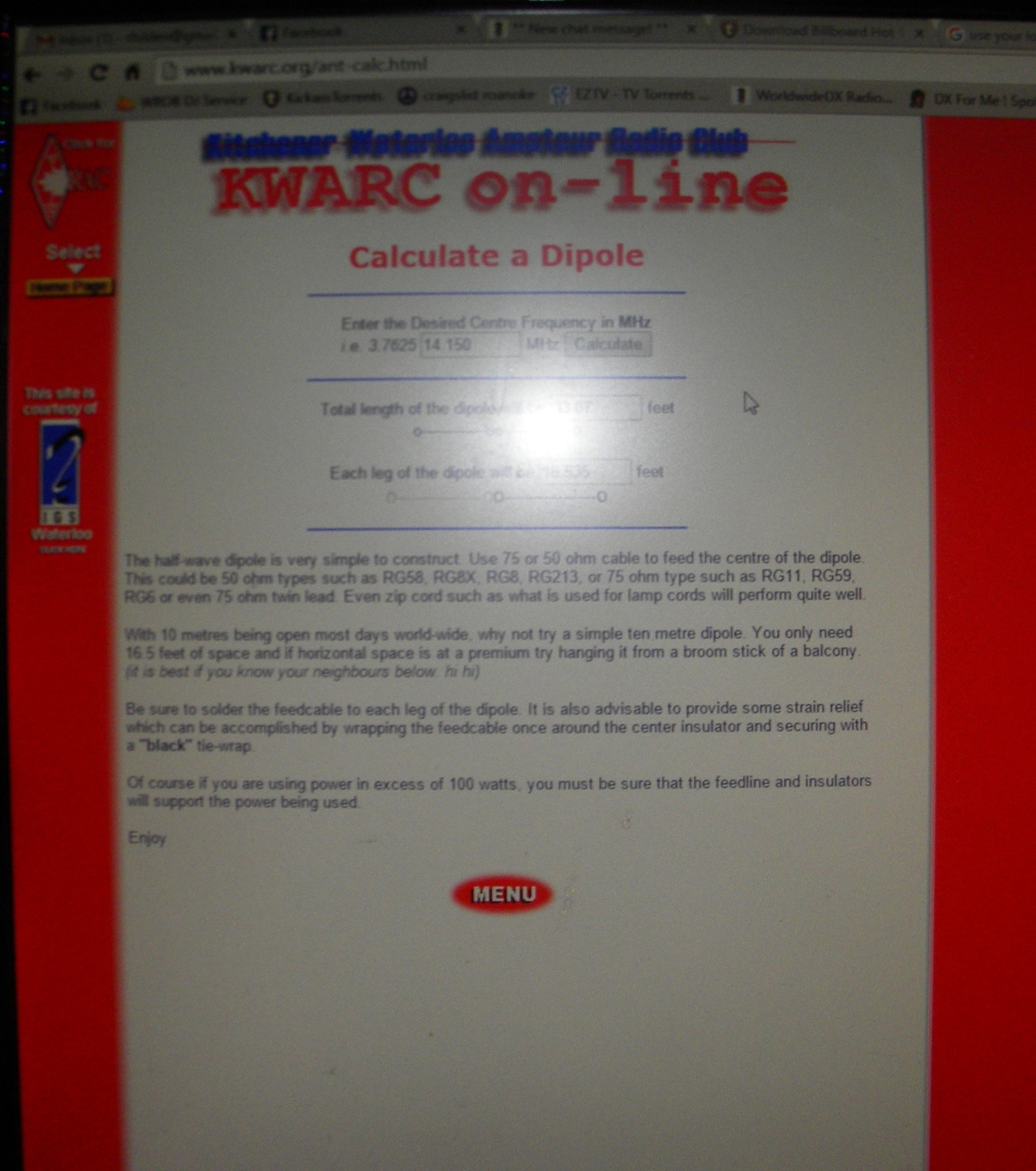 We need to calculate the length of one leg of a 1/2 wave dipole for 20 meters. The formula for this (copper wire) is length in feet = 234 divided by the frequency in megahertz. Or you could simply use an online calculator like I do. HERE's ONE! Since I am an EXTRA class CB'er, I chose the lower end of the 20 meter phone sub-band as my cutting frequency, which is 14.150 MHz. This came out to 16' 6-3/8". So I made it a little long (I will be using a tuner... see 'notes') and cut the coax.