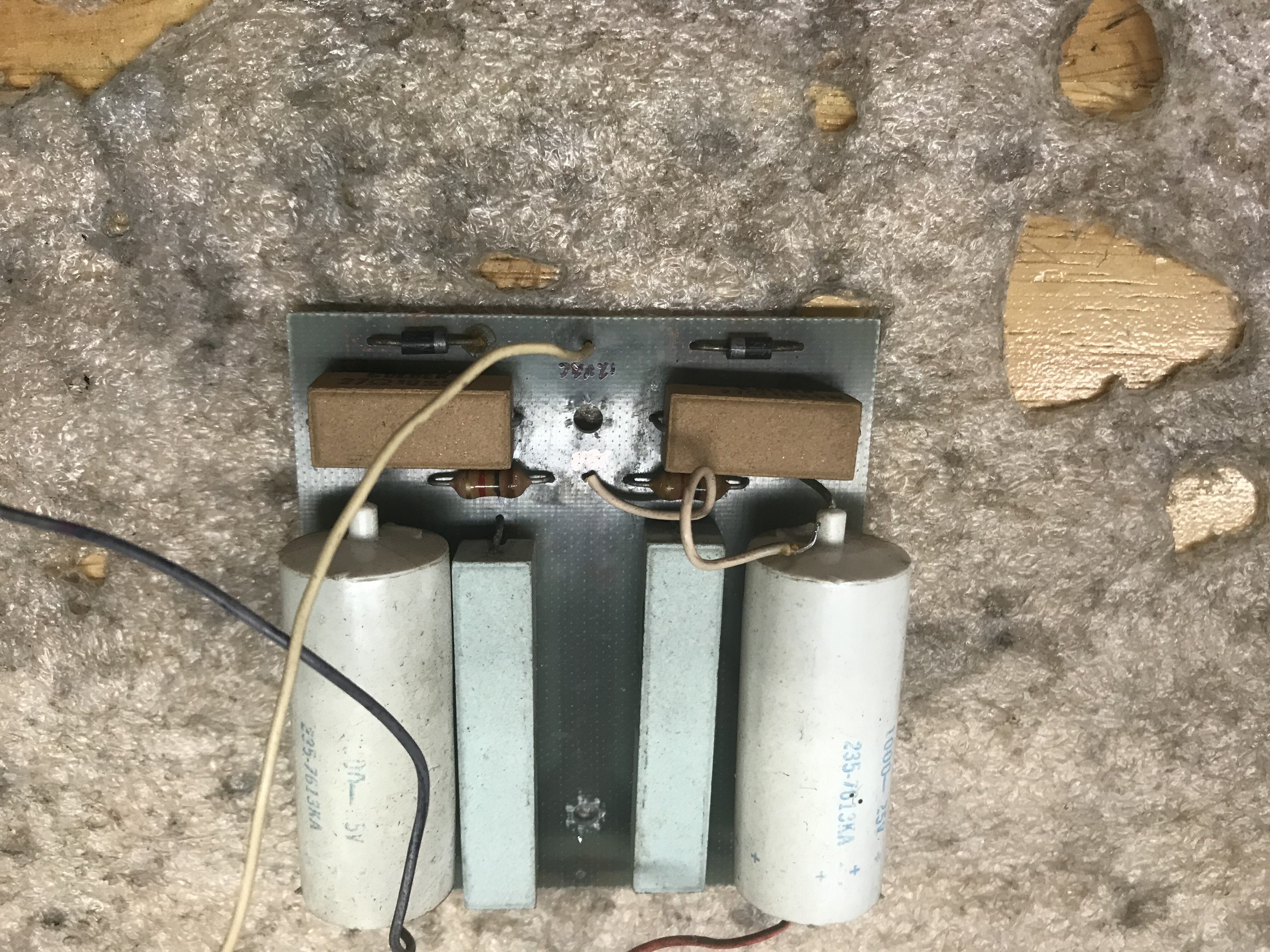 You can see the white wire is frayed and has been hot. It was pinched under the edge of the circuit board along with the 2 coax cables-for years! The wire comes from the upper left terminal of the Cinch-Jones plug (total of 3 wires on that terminal) I believe it to be 1 of the 12vac feeds from the transformer which is later rectified and applied to the control grid of the driver tubes.