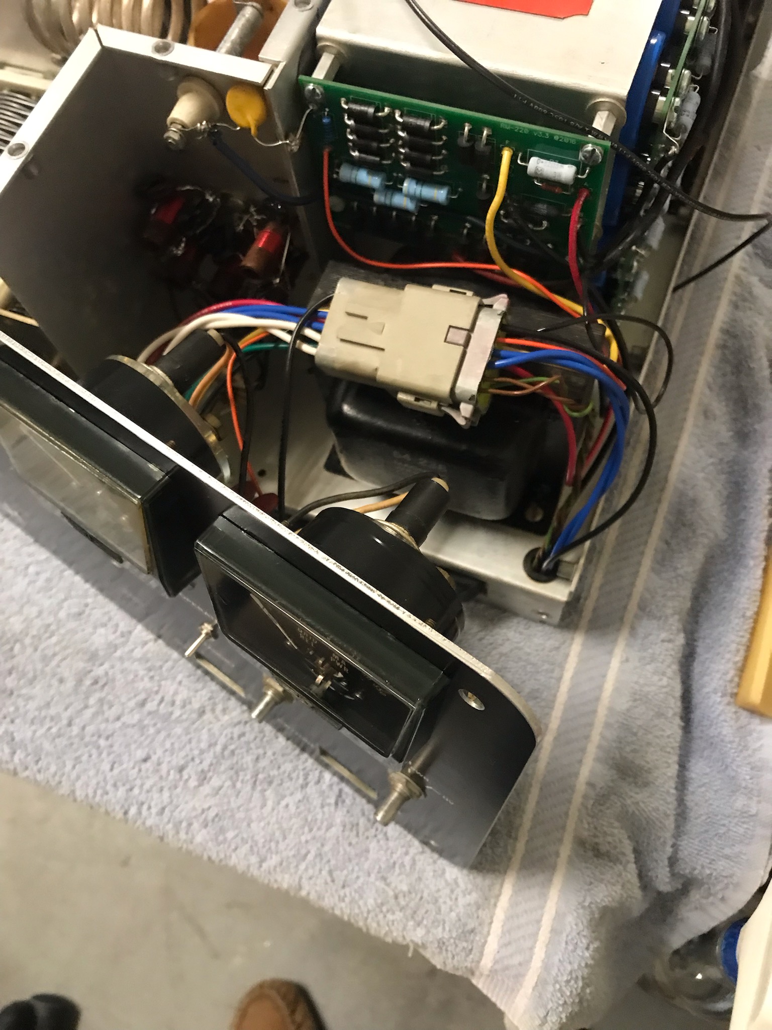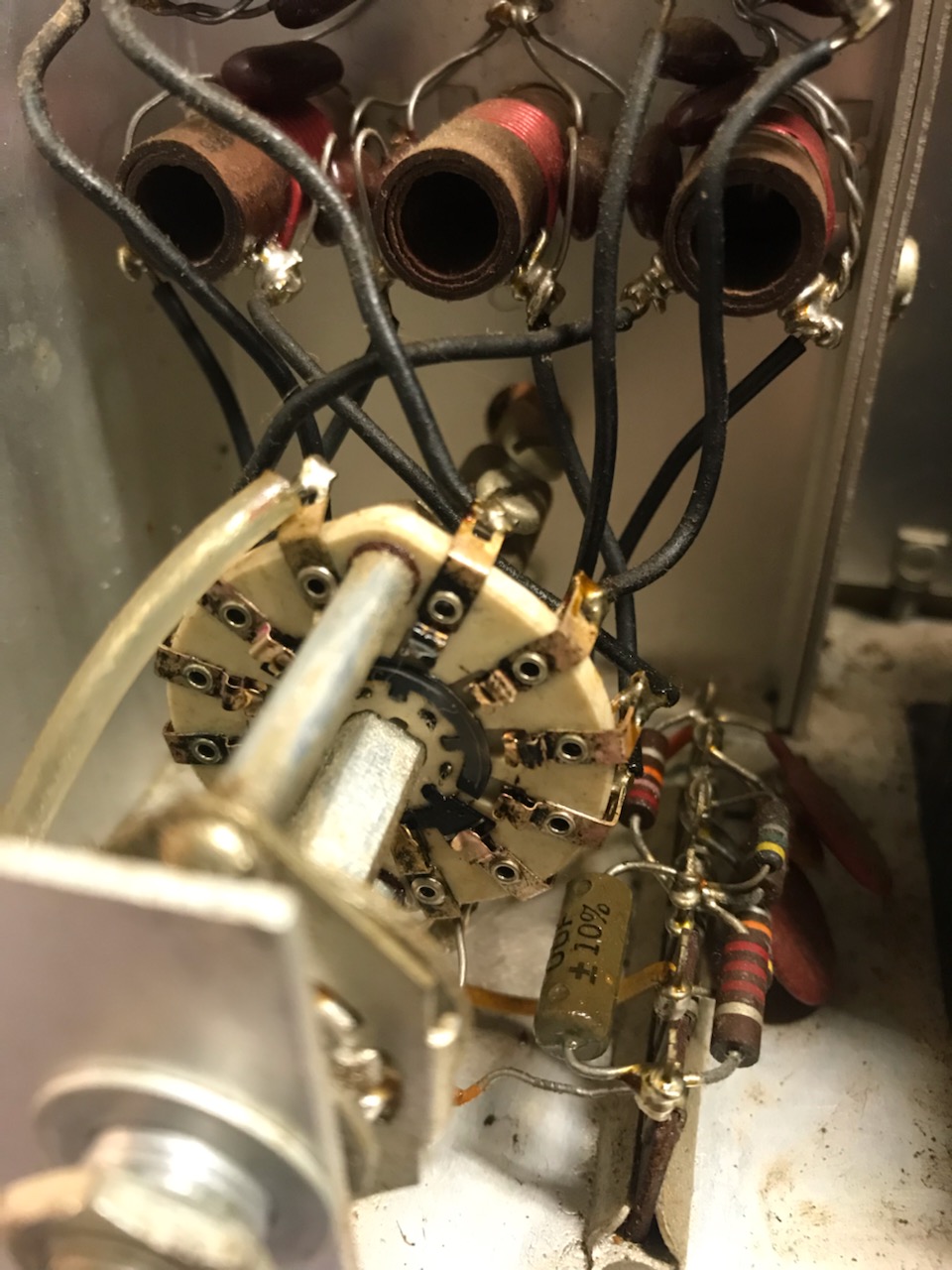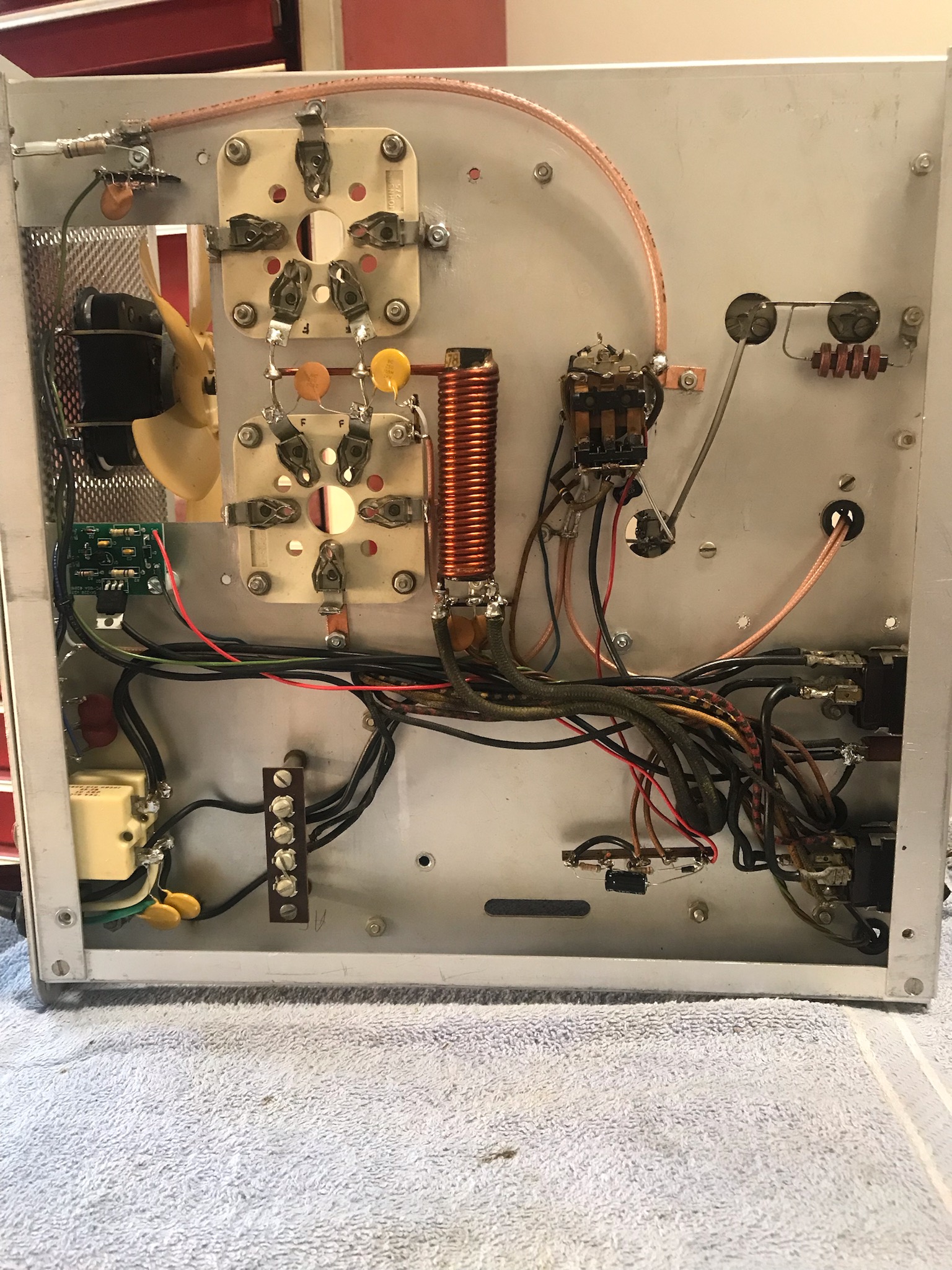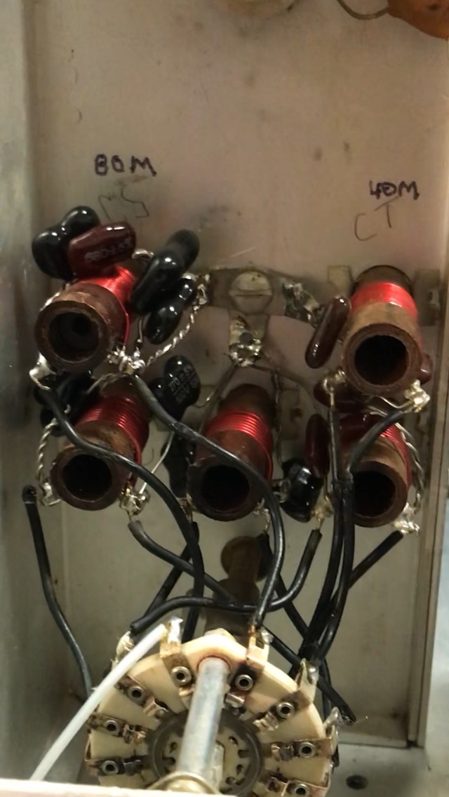 Below is the input section after the 80M, 20M and 15M coils and capacitors were modified. 40M on the top right and 10M on the bottom right.