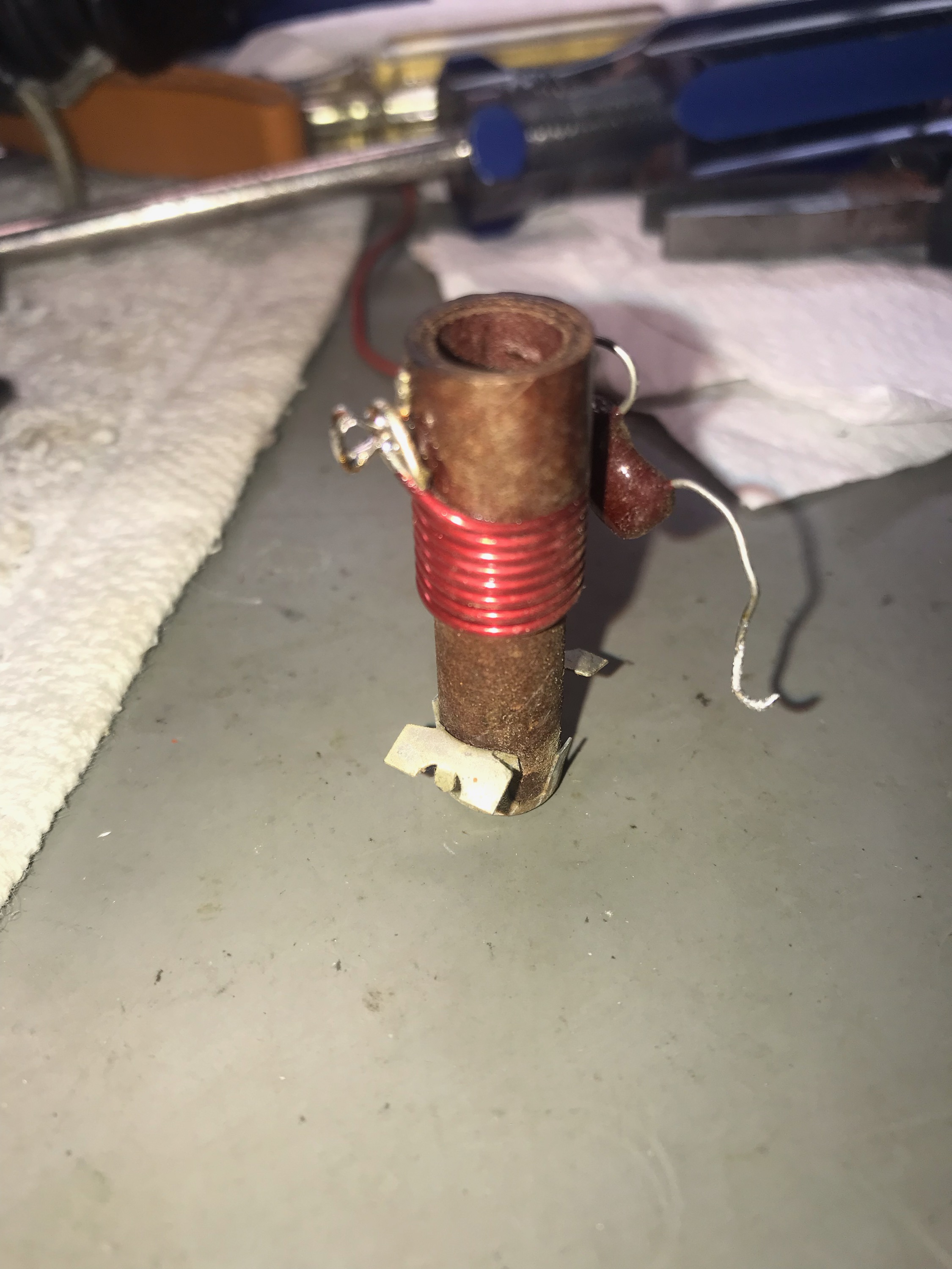 The inductor for each band was removed one at a time and in most cases turns were removed from the coil and the input and output capacitors were (in most cases) increased in value.