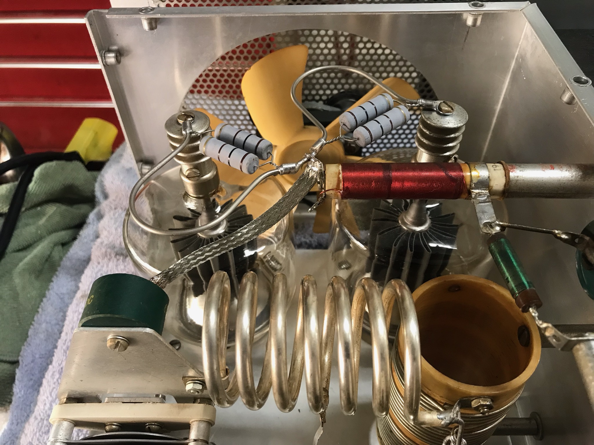 The assembly was installed and the circuit was tested using the VNA at the input connector and a dummy load at the output connector. Resistors were temporarily installed from the cathodes of the tube sockets to the grid pins of the socket to simulate the loaded resistance of the tube. The appropriate band was selected and swept for the frequency involved. The tuning slug was adjusted for the best match as reflected on the VNA. This was all done without powering up the amplifier but will need slight adjustment under full power when all other work is done.