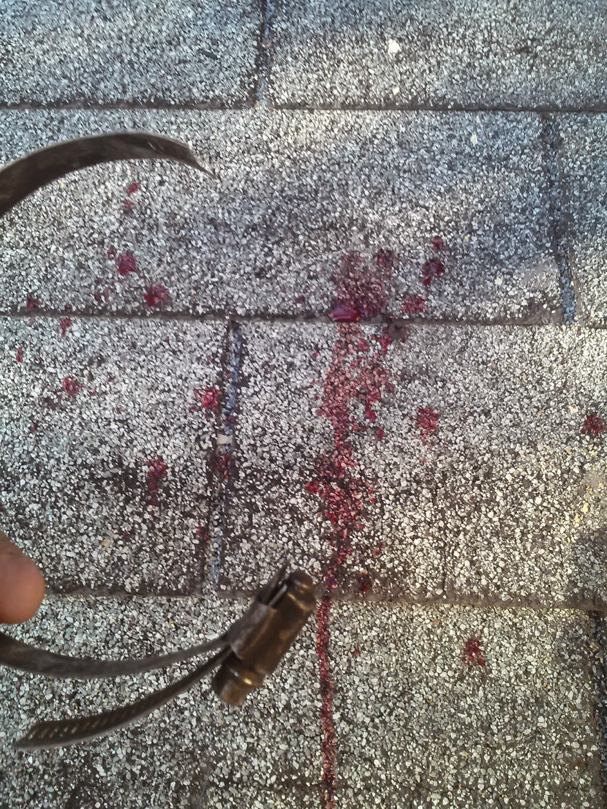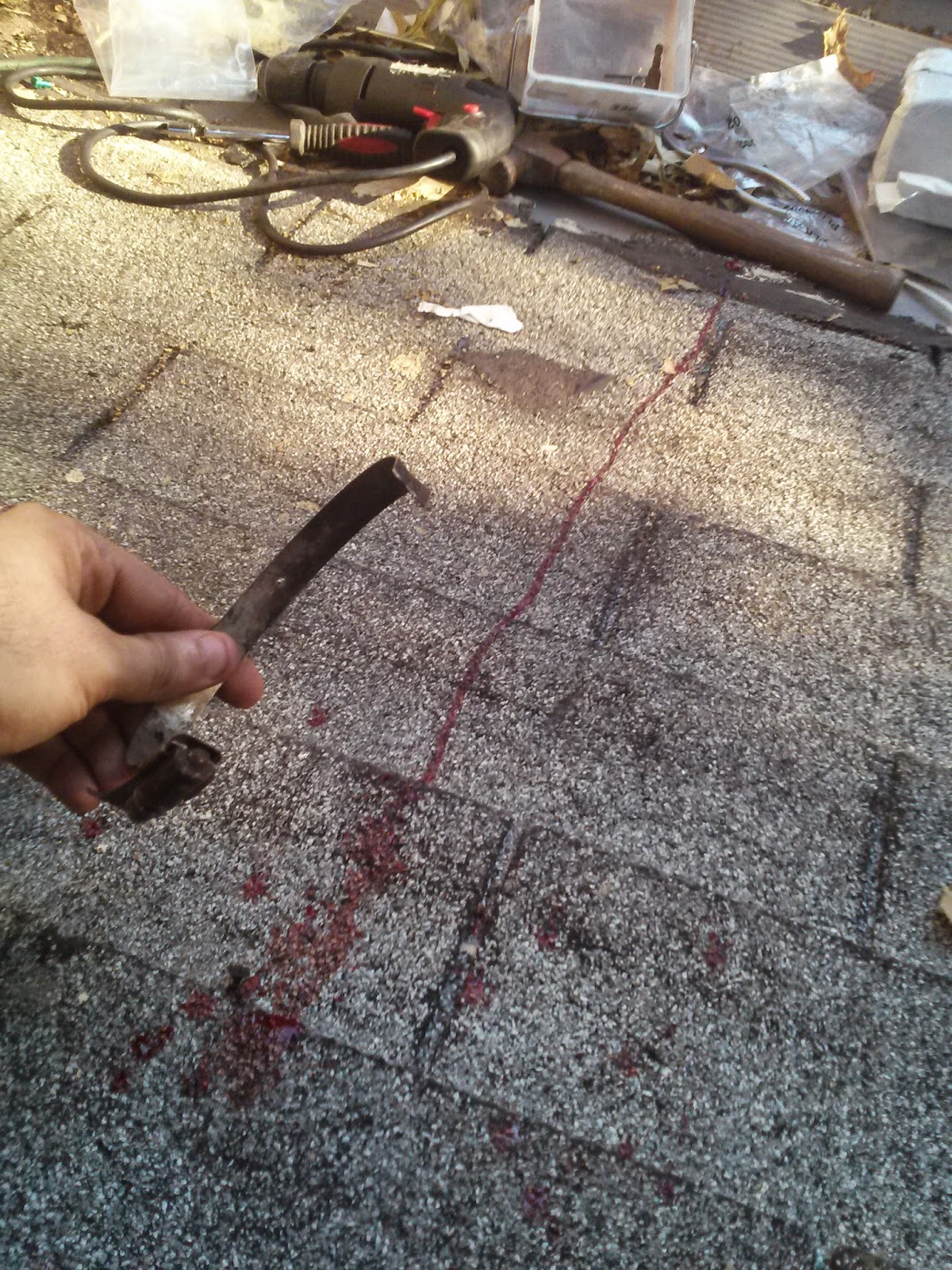 By the time I got to the kitchen sink to wash the gash, there was a river of blood following me... I bandaged it up, got another drink and got back on the roof