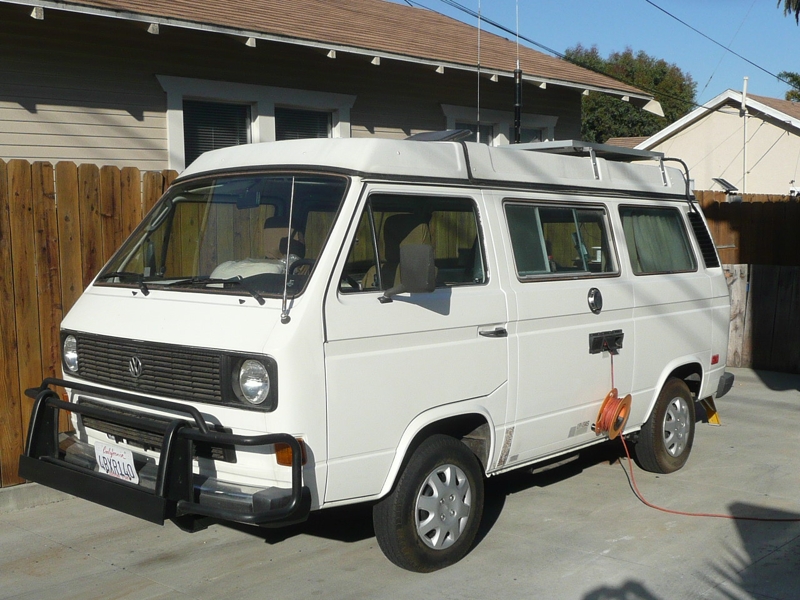 Well, looks like my Mercedes CLK wheel deal has gone sour, so I took off the cheezy hub caps (that were on the vanagon when I purchased it), scrubbed the stock 14" steelies real good and painted them.