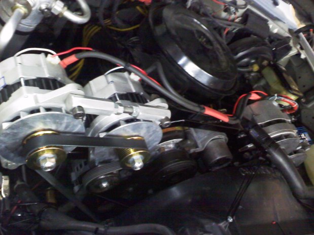 Basicly 800 amps or power..5 alts 2x220 delcos..2x 160 lesse nevilles and 1x105 amp unit to run the truck..and 2xtranspo voltage regulators variable 21 volts..nice clean setup works great for them 10kw tests and dx spikes.73sss and hammer down!