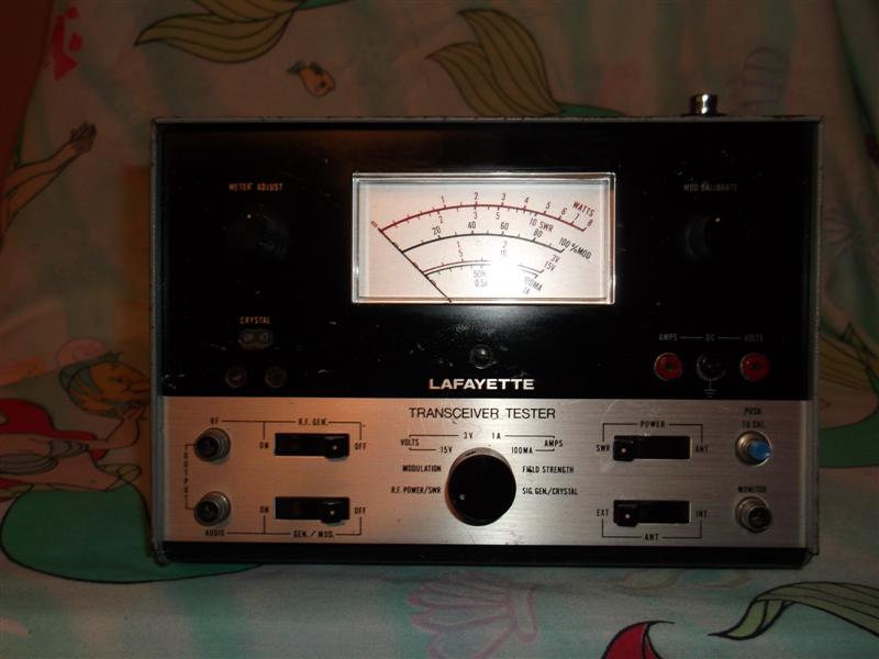 This tester measures 7" x 5-1/4" and is 2-3/8" deep. It will test the following: SWR/ANT, % MODULATION, R.F. POWER, FIELD STRENGTH, SIG GEN/XTAL, AUDIO GEN. & tests crystals. Has an outlet for connecting a oscilloscope. It operates on a single 9 volt battery (not included)