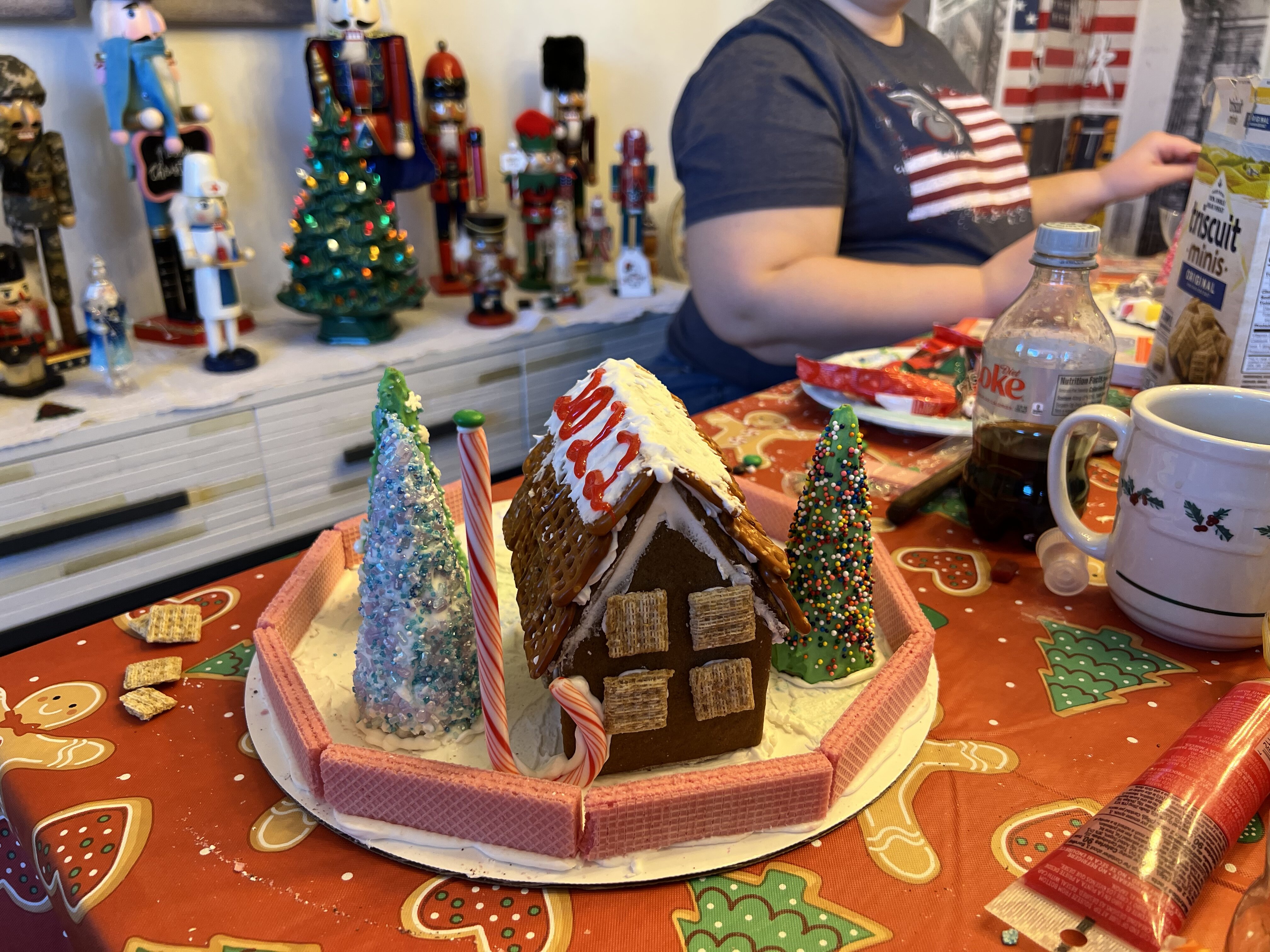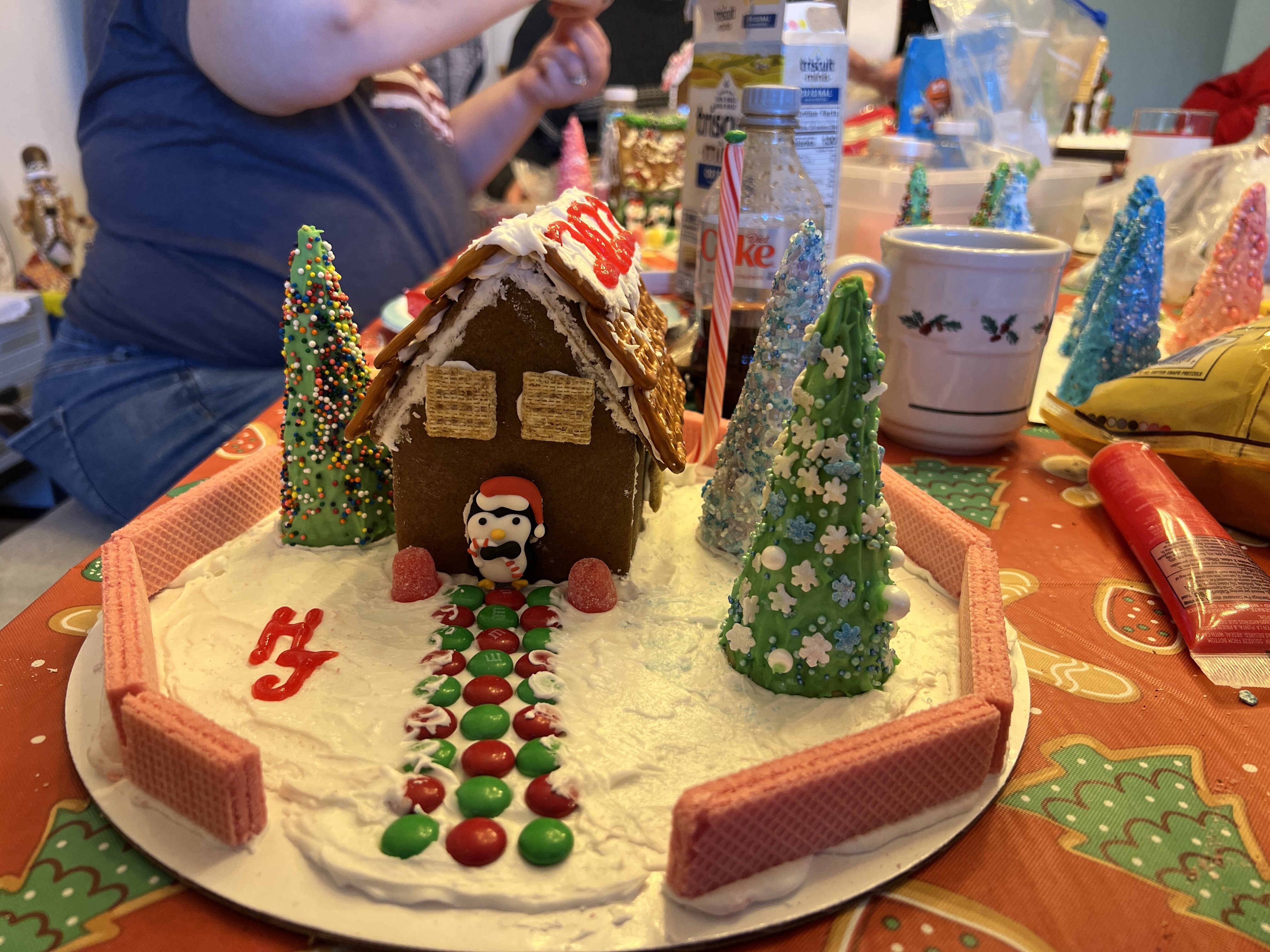 Good afternoon everyone. A little something I think people might get a kick out of. We are at the mother in laws doing gingerbread houses. Couldn’t complete my house without an antenna out back
