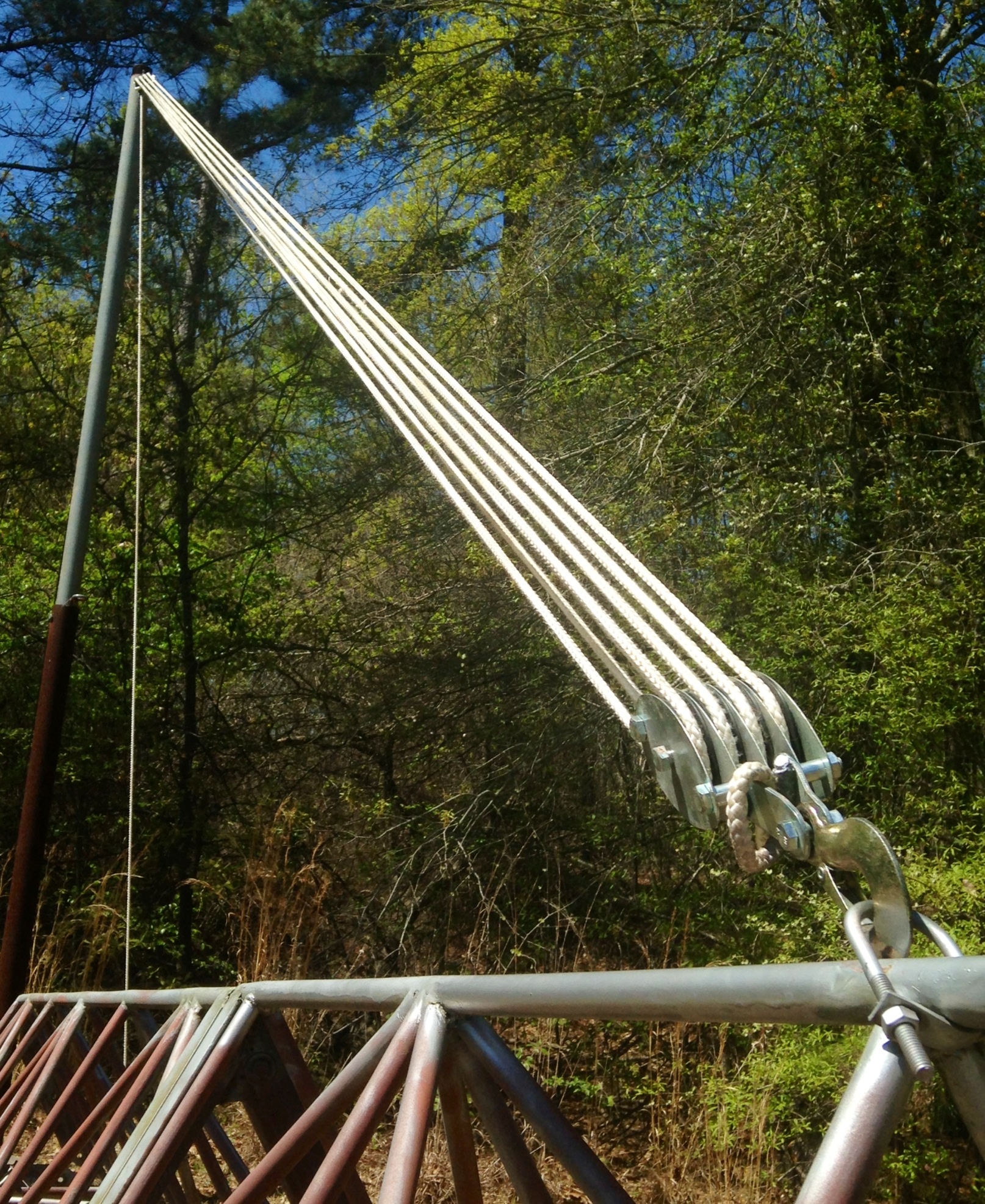 It's got the stainless steel 1/4 wave whip on top that's never been used. I had it mounted just in case I might someday. I might hook it up today and use the mast/tower as the other half of the antenna. It takes a few trips from the hoist vehicle to the rope I use to off set the tower in order to lower it. That just attests to what kind of force reduction the rope pulley system has. I keep the hoist vehicle attached to the rope to control the angle the tower is at,periodically making adjustments because of rope stretch