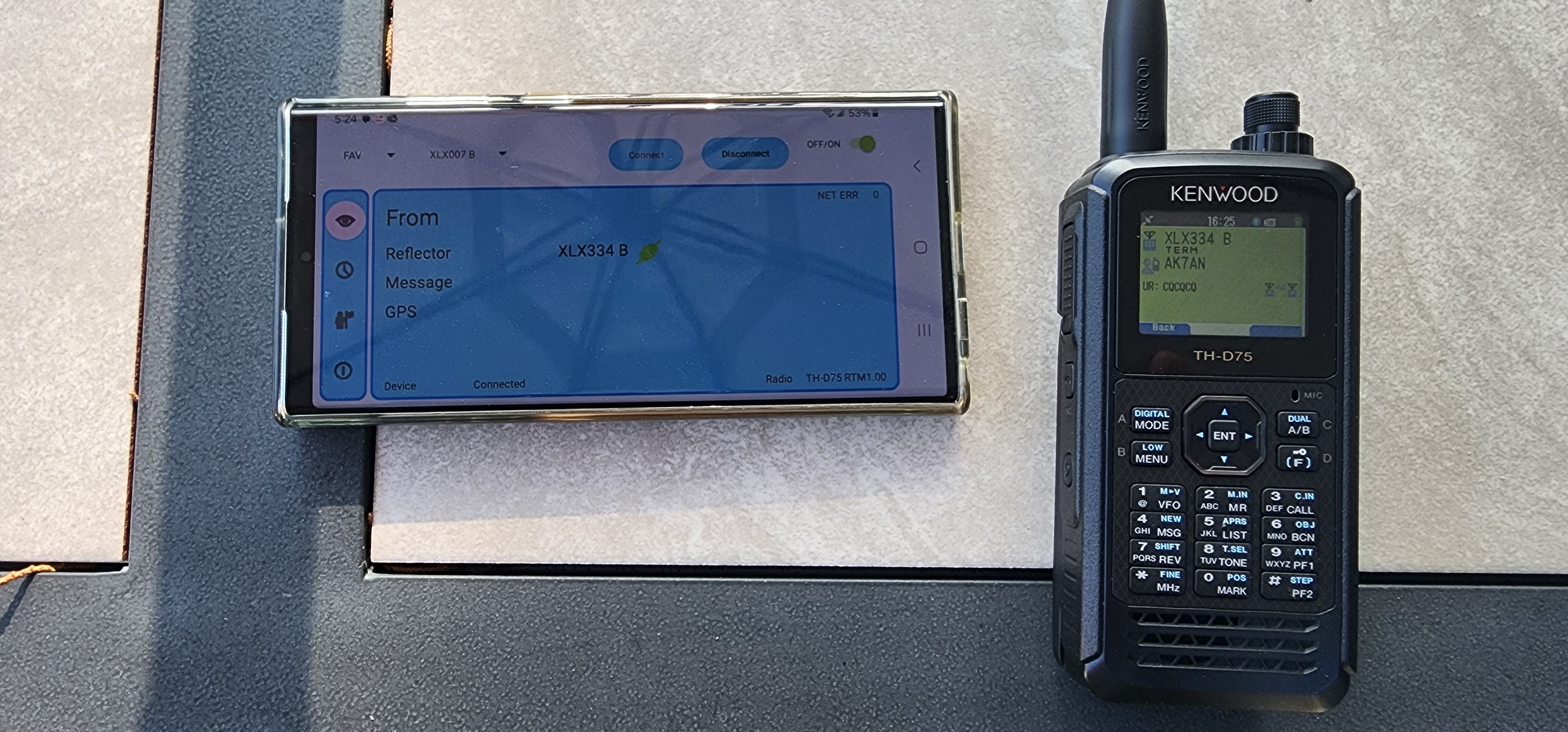 Lastly, in the BlueDV Connect app, toggle the top right on/off button to "On", which will initiate a bluetooth connection to the radio. (Hint: in BlueDV Connect, make sure you select the TH-D75 as the bluetooth device in the settings). Now that you've done this, you use the radio just like it's connected to a hotspot or internet, connecting to whatever reflectors or repeaters desired. Here's a pic of my phone and TH-D75 connected to an AlabamaLink reflector: