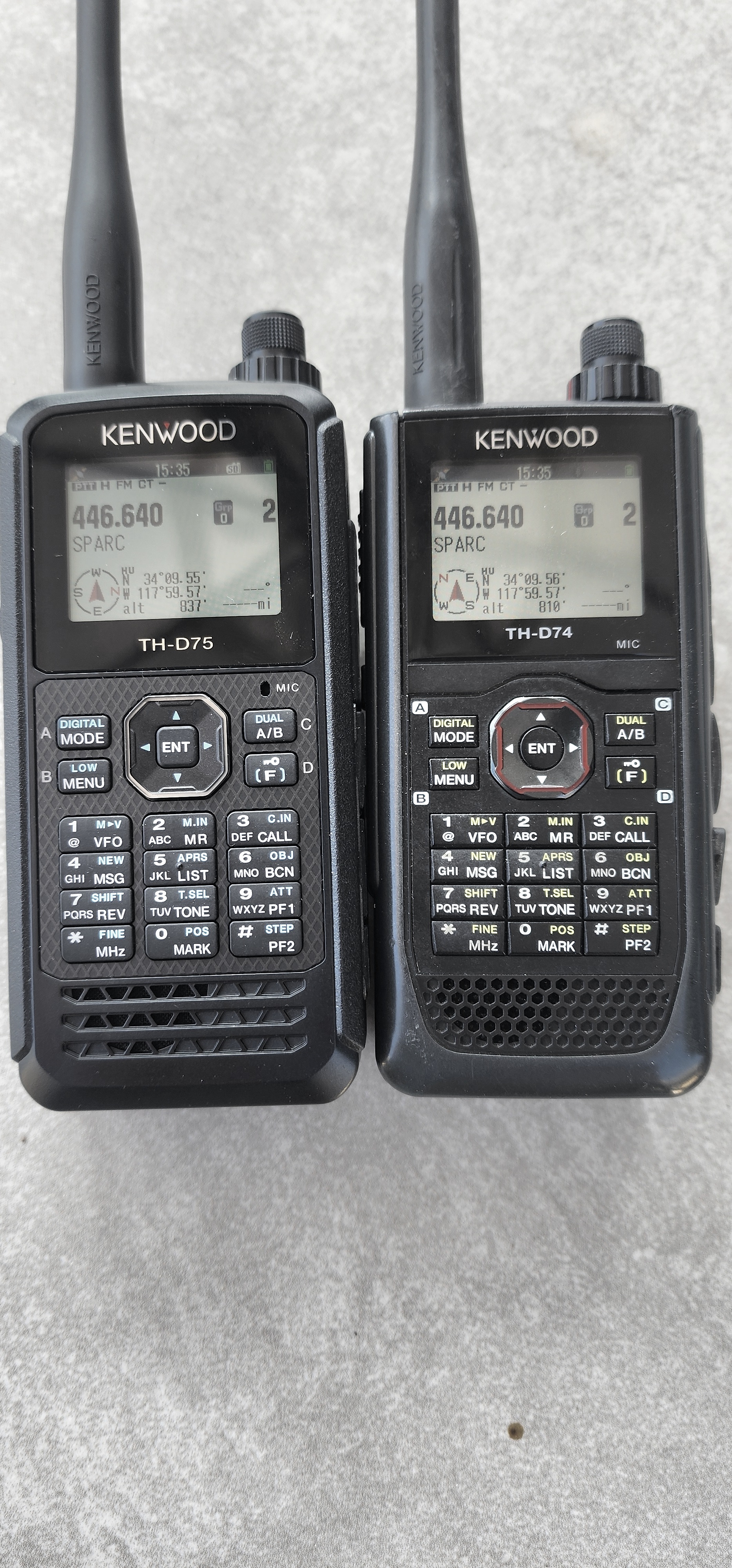 The new TH-D75 is almost identical in form factor to its predecessor with only some new rounding of corners, different texturing, and improved rubber covers for the ports. Here's a pic of the two radios next to each other: