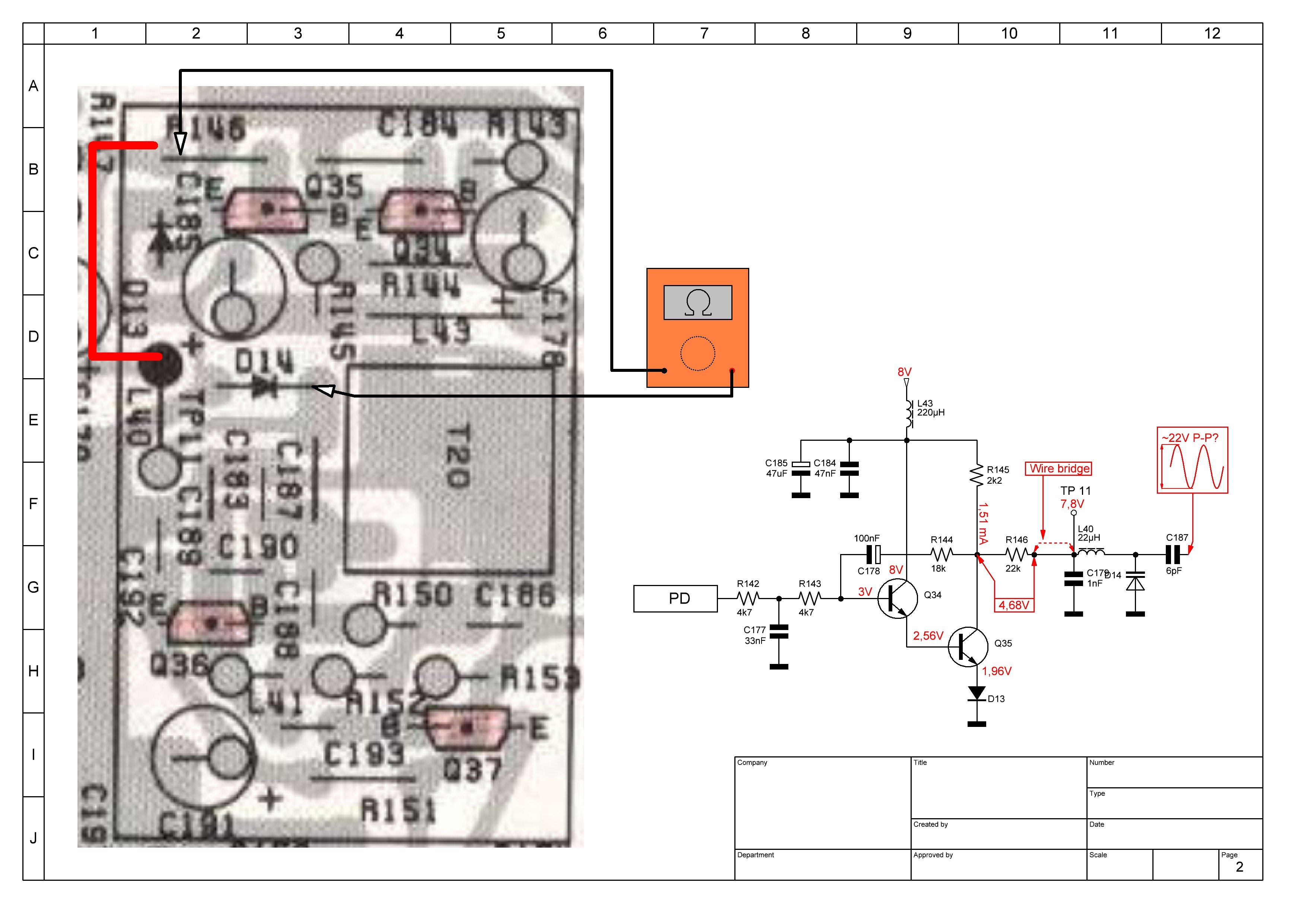 Tech 5 and Brandon: And results of ohms test from D14 cathode to R146. Nothing out of ordinary other then L40 has 0.6 ohms + 0.3 ohms DMM leads = 0.9 ohms as per your diagram I've filled out. The L40 0.6ohms is the only thing adding resistance. I cant see an any anomaly when testing resistance between component legs tied to the TP11 trace either.