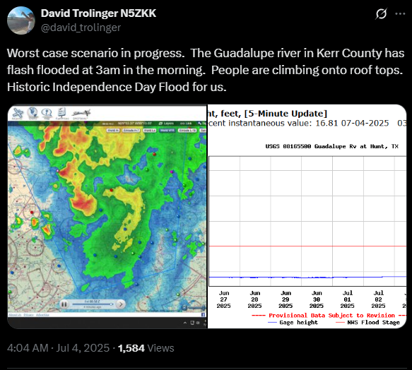 My station has been featured on the national news the past couple of weeks. I was awake and monitoring during the Kerrville Kerr County Independence Day Flood at 3am. I had a camera running along with radio recorders. The city and county are tight lipped and militarized so monitoring of the public service radio is difficult to impossible now. CBS probably had the best coverage so I will share that story here.