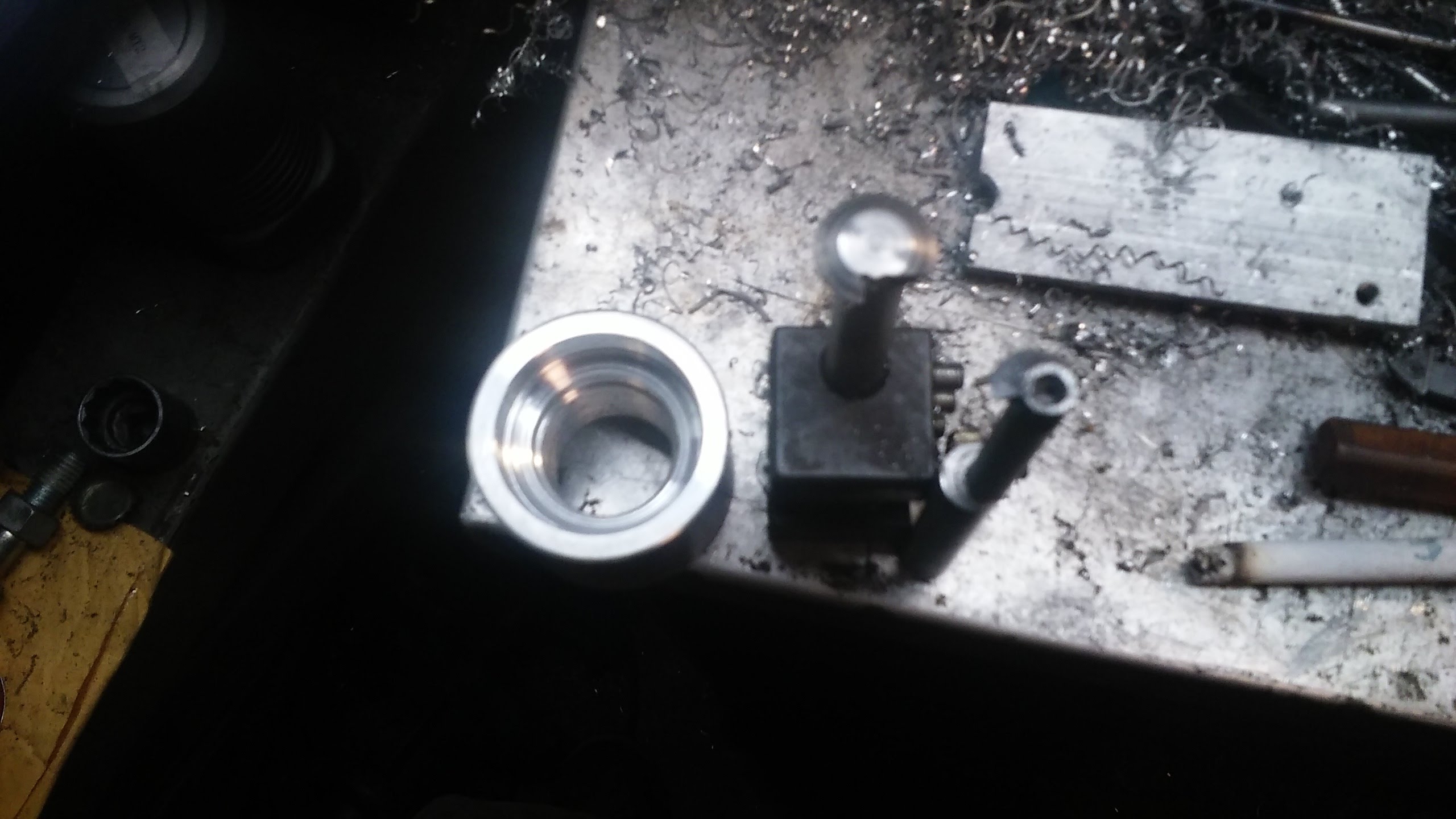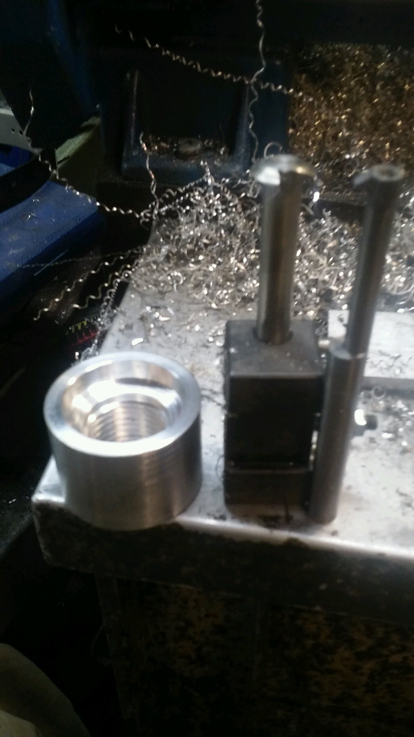 Once I got it to begin threading I ran maybe 6-8 spring passes with naphtha (zippo fluid) for cutting fluid. The counter bores are 1" to clear the register and 1.63xx" to clear the shoulder so that the threads, register and shoulder are protected.