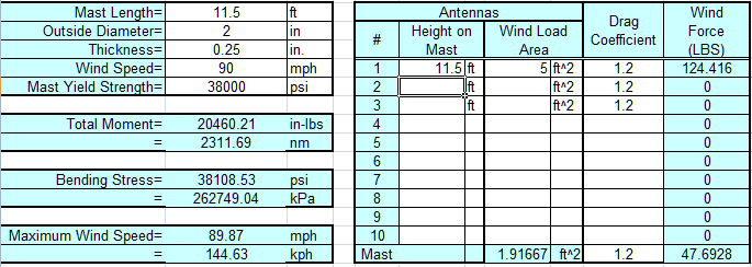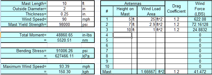 I have attached an attempt to model the mast stress with the 30' quad, 2m yagi, and 2m vertical.