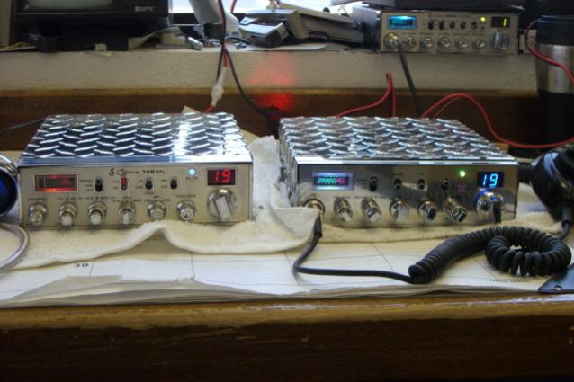 working on my mobile right but here are my gen.ll and my old school cora 148gtl.Here is my toy box.both of them have ledss in them the gen. has the 7 color change leds in meter and tx light and in bottom lid where speaker is and the 148 has just on 7 colr light in tx spot and in mic head,meter and speaker have red and blue.when you key mic the red gose off and the blue come on when it is in tx. my ext. speaker has the the same light setup red and when you tx it gose blue.my ham rig is a icom208h.i will try to post apic of it when i finish my redo.