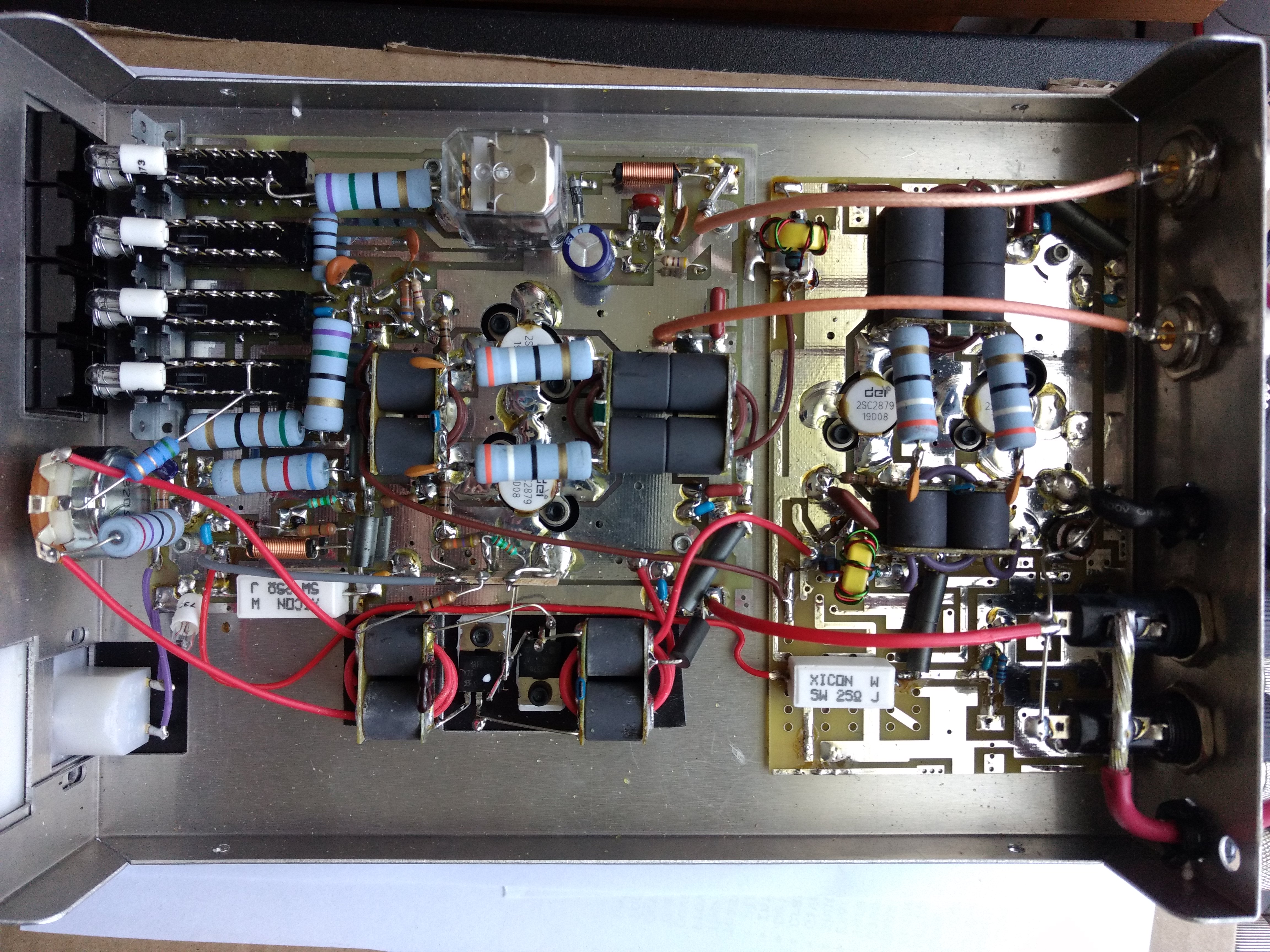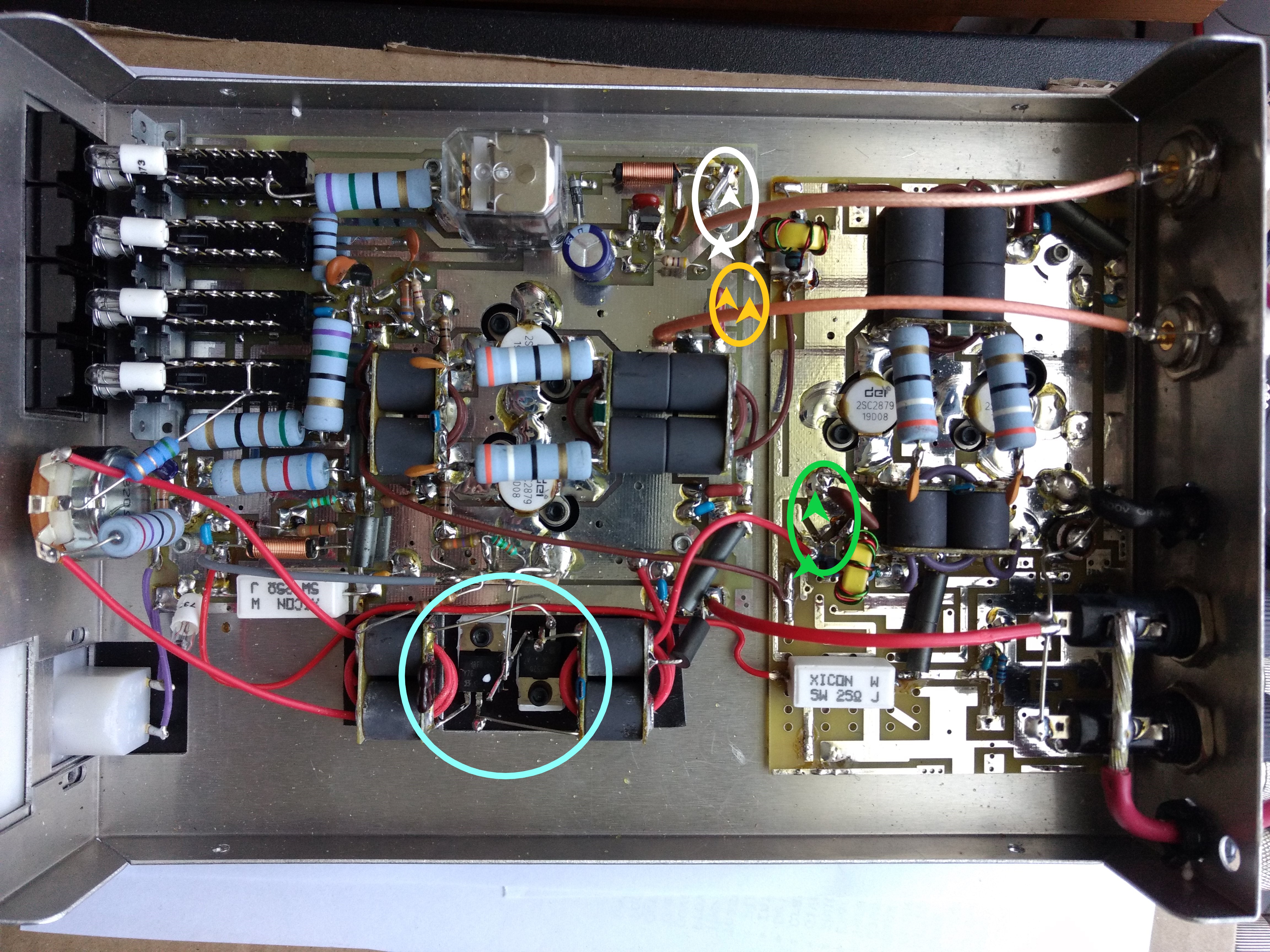 It appears as though there are no tuning capacitors on the output side of the amp, nor is there a tuning capacitor between the driver and the finals. I'd suspect that's the issue. Unfortunately, Texas Star has really dropped the ball when it comes to the new amps, they just throw the DEI transistors in and don't bother to re-tune the input and outputs, and the DEI's do NOT tune the same as the old Toshiba transistors. Looks like you're going to have to some re-tuning to do.