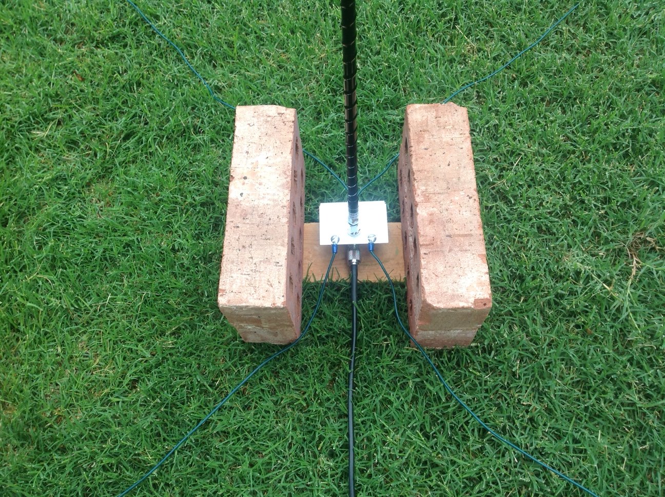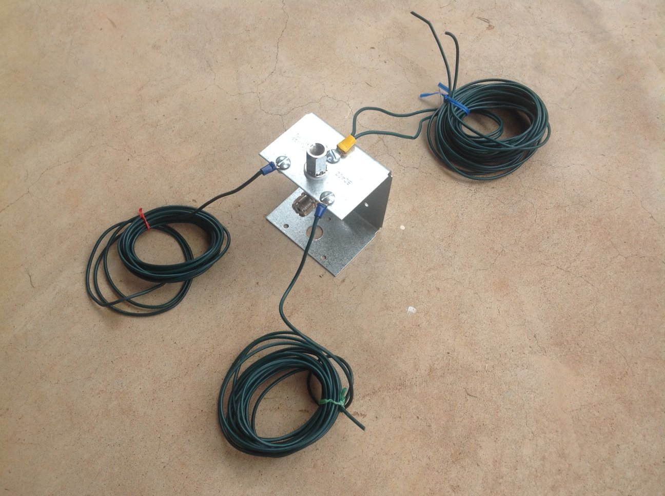 The four radials attached. (The Strong Tie came with 3 pre-drilled holes and rather than break out the drill I simply attached 2 radials to the same terminal.)