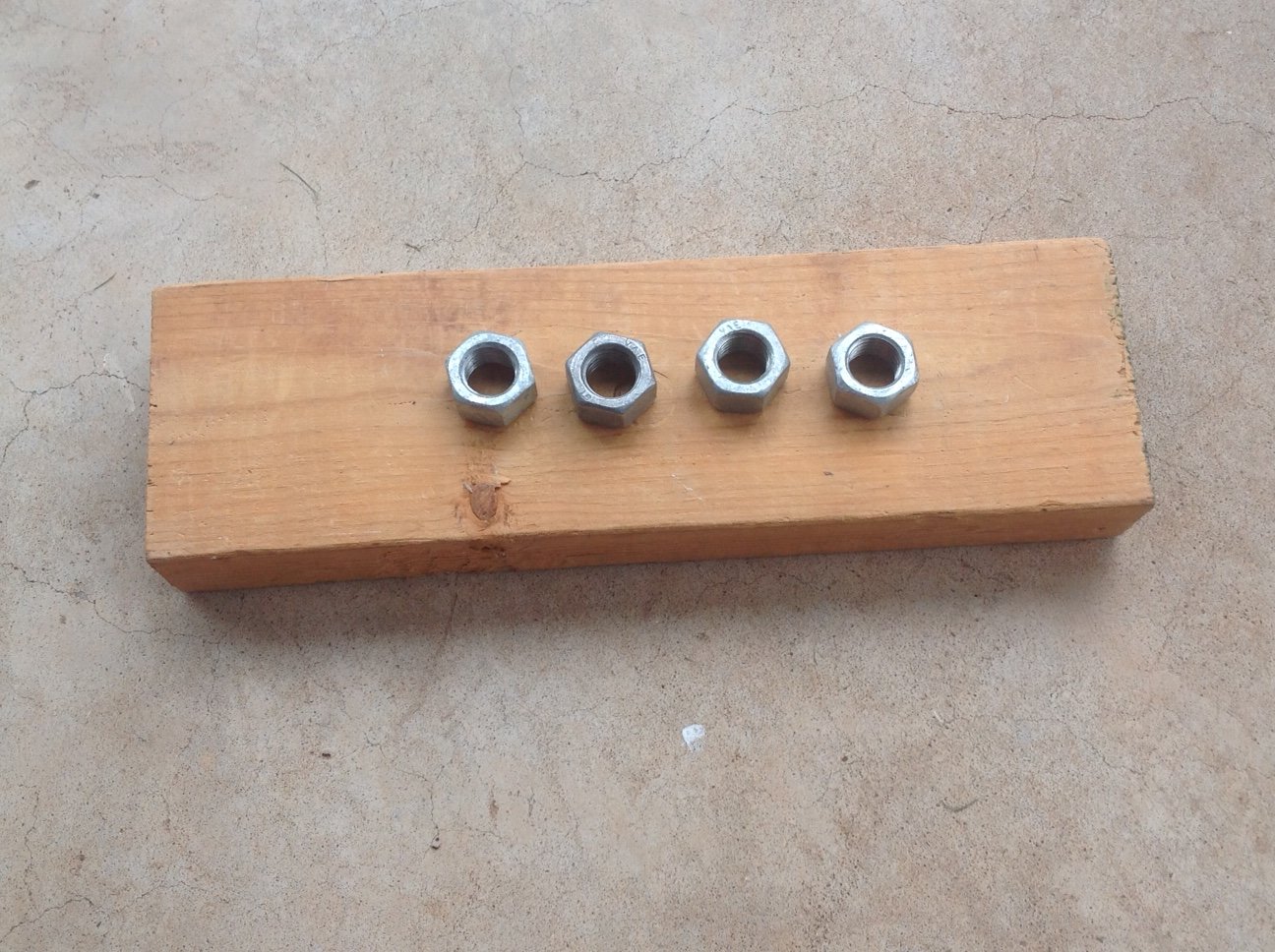 This short piece of 1X4 is used to hold the bracket on the ground. It simply lays across the bottom flange and is secured with bricks. The four bolts attach to the ends of the radials and serve to hold them in place .