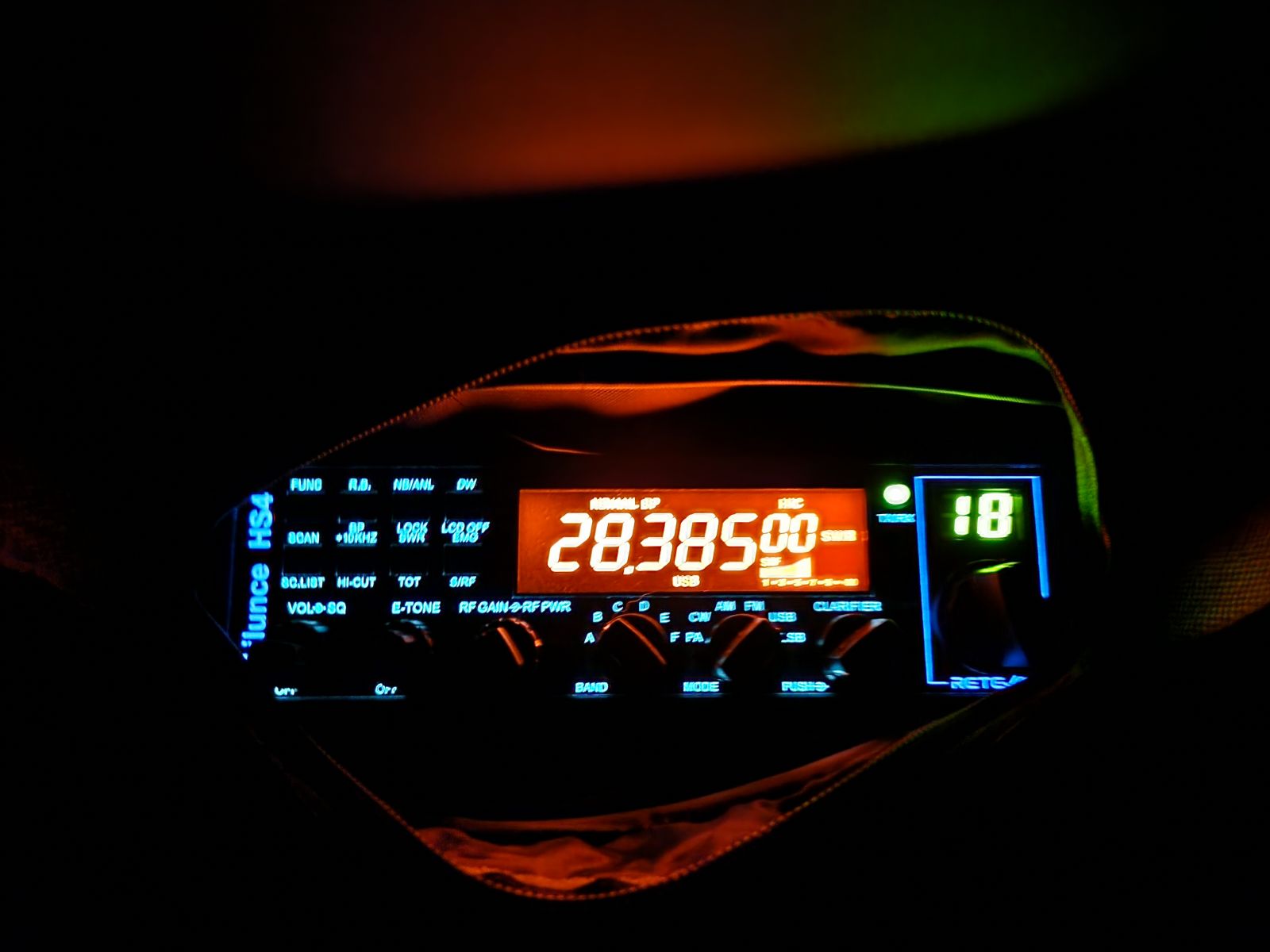 With just 25 W or so, I've been having a ball. Nothing but unsolicited compliments on the audio (K-Po amplified mic) and the NR feature works pretty darn well. Mind you, my ears are used to my Elecraft K2, FTDX10, and FTDX101MP. Here's a shot of it in a rig-bag hanging from the headrest. (The "kids" do the driving now, hihi.)