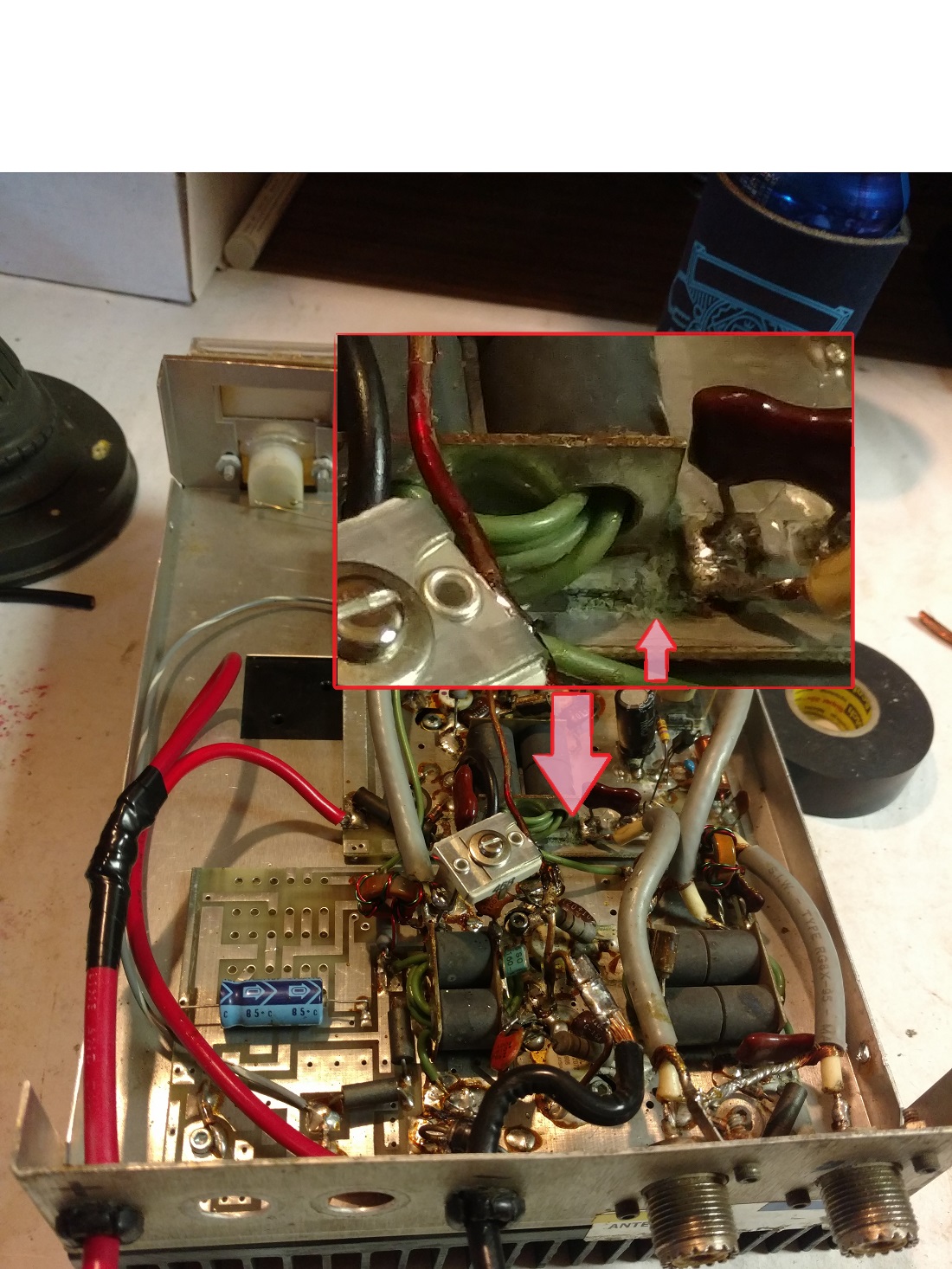 The coax and cap go straight to the output SO239. I really should get one of those magnifying lamps. It is next on the list. The whole thing could use some cleaning. The guy had it on the floor of his car and it looks like it got damp. What would be good to clean this with?