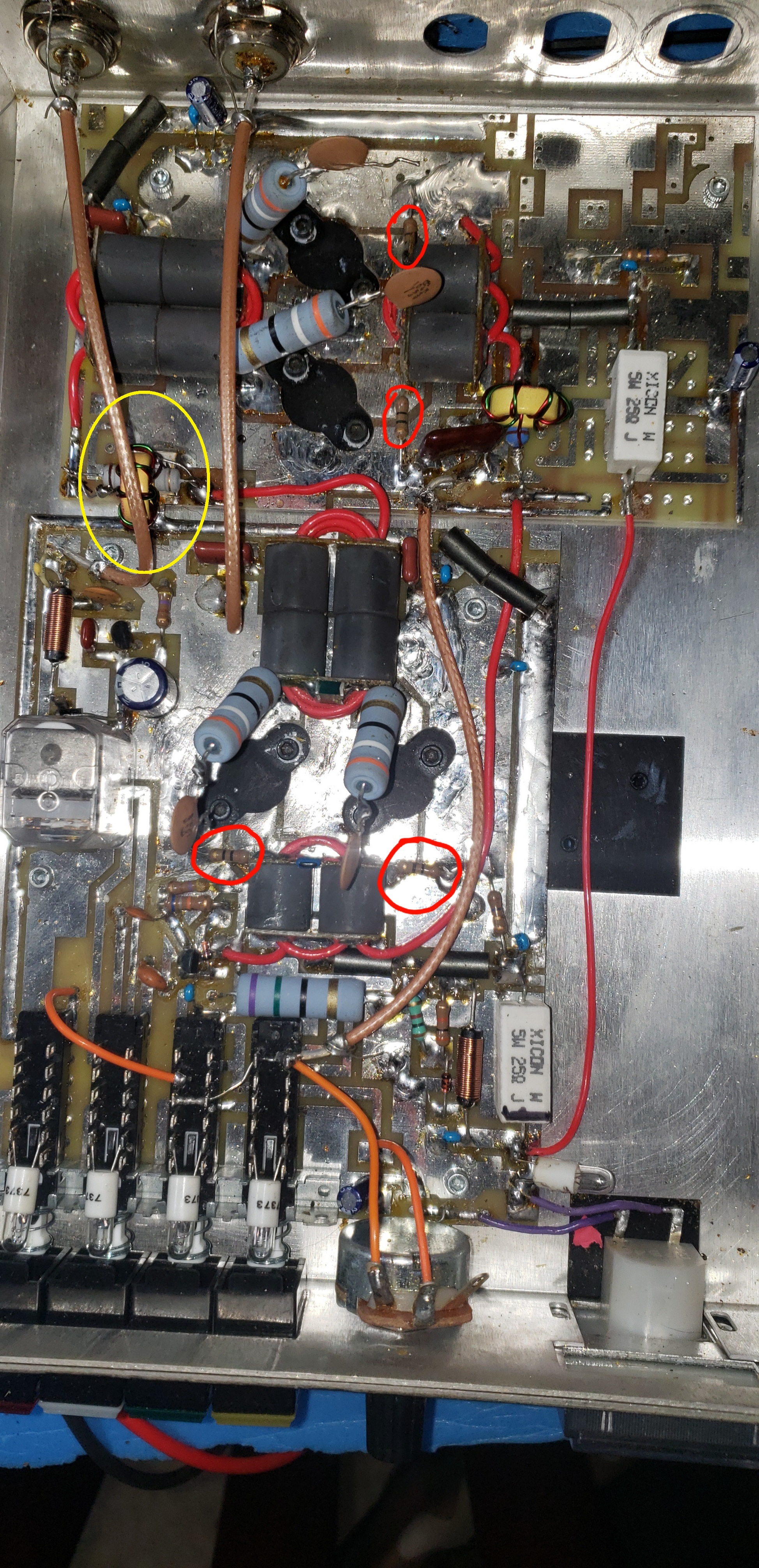 This is my 500V after a temper tantrum.... If any of the resistors in the red circles are discolored, the power transistor corresponding with it is most likely blown. Also, take a good look at the resistor in the yellow circle and make sure it's not burnt, that usually only happens when you drive it into nuclear meltdown though.