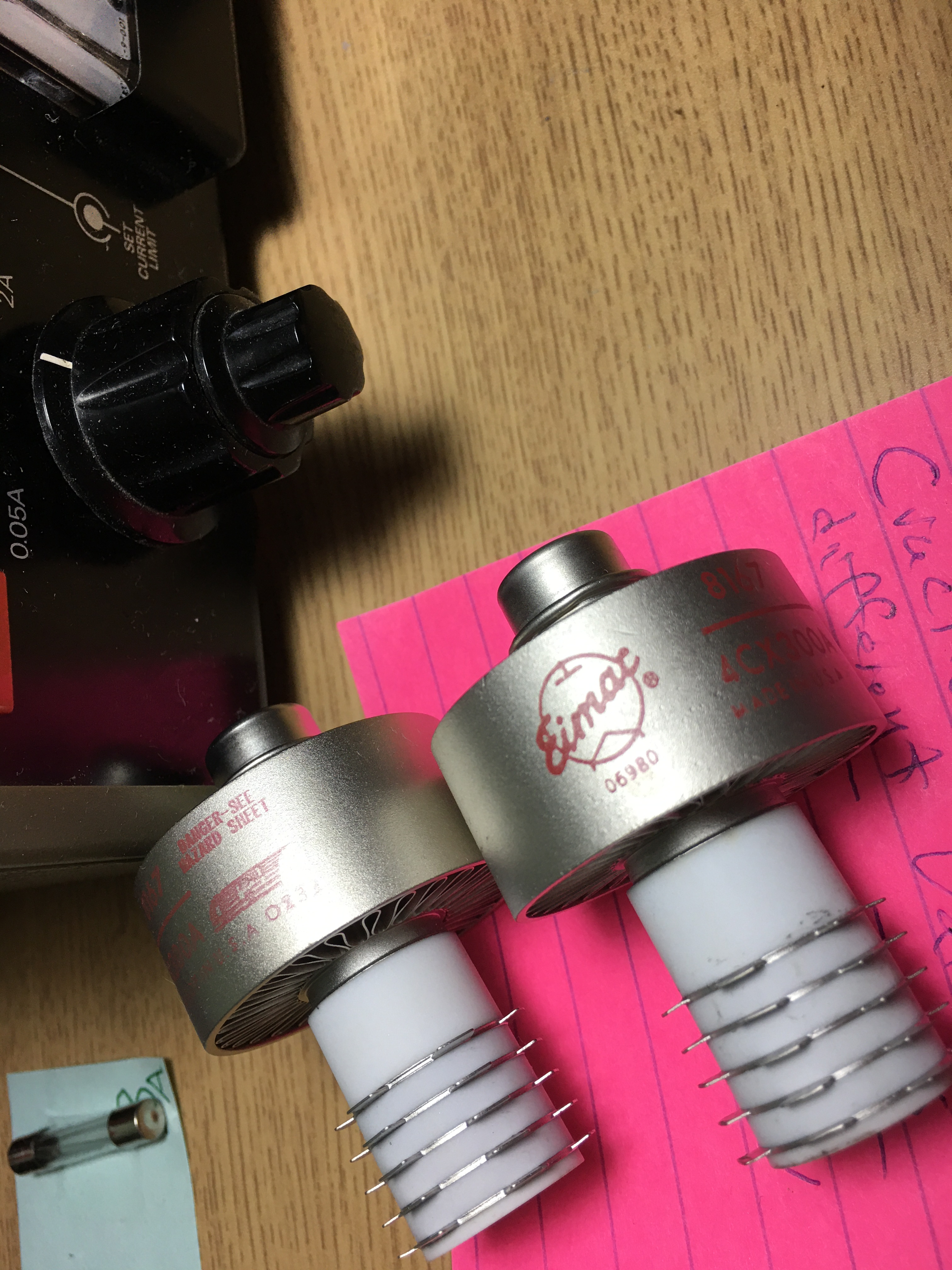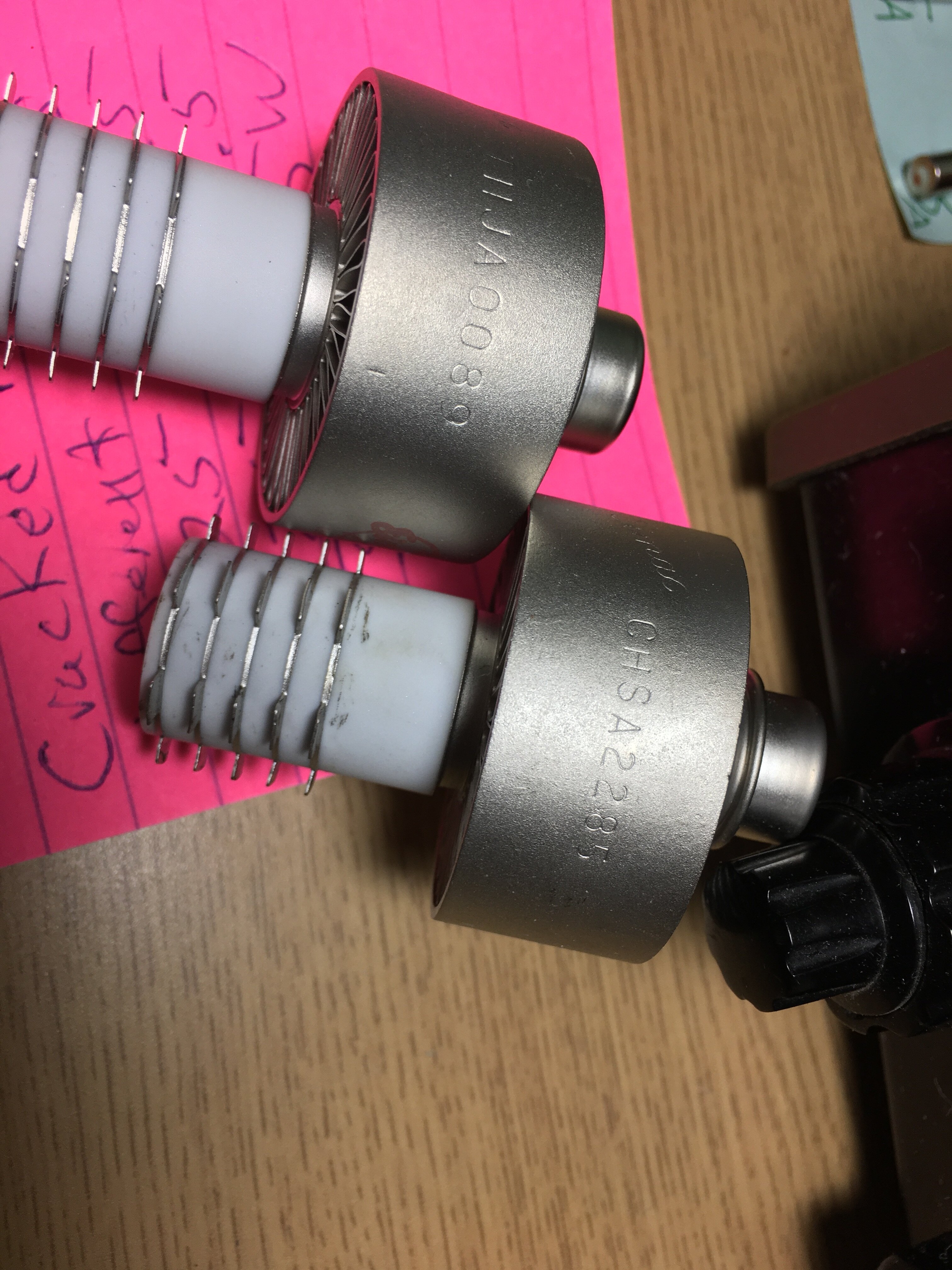 Stamped in the metal: CHSA2285 and THJA0089. Printed in ink: “87 38" and “0234". Best guess is 1985 & 1989? There’s also a graphic printed on one tube that I don't recognize. I thought maybe "CPI" but CPI was not founded until 1995. IDK, relics perhaps. Anyway, my sockets are getting cold. Time to start the burn-in period.