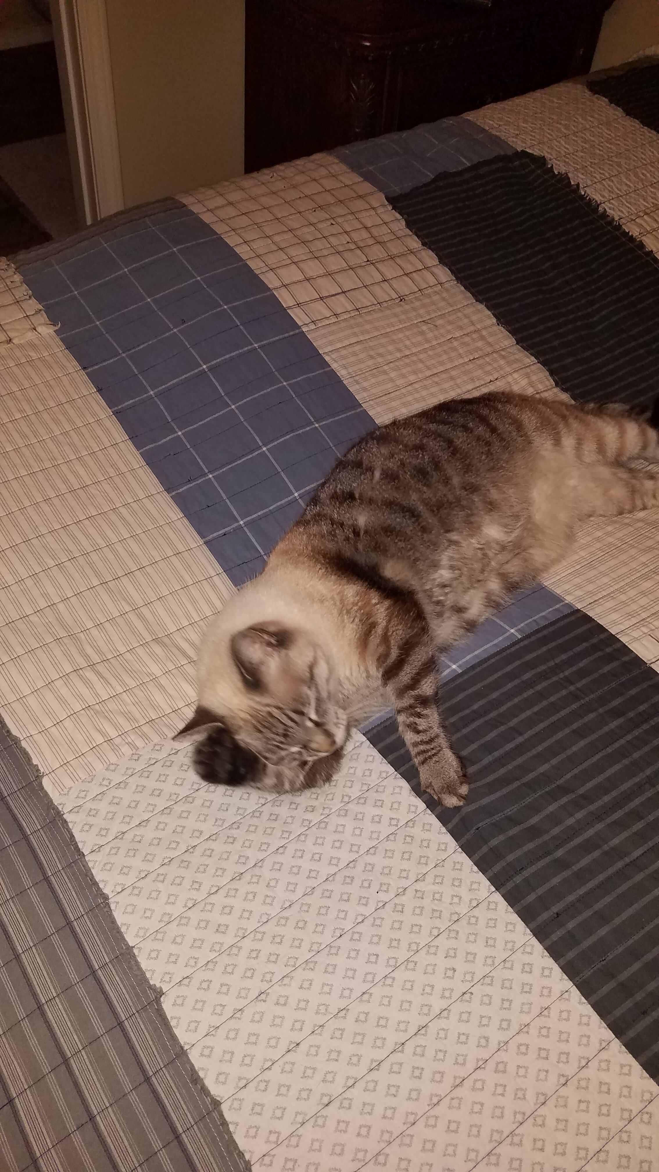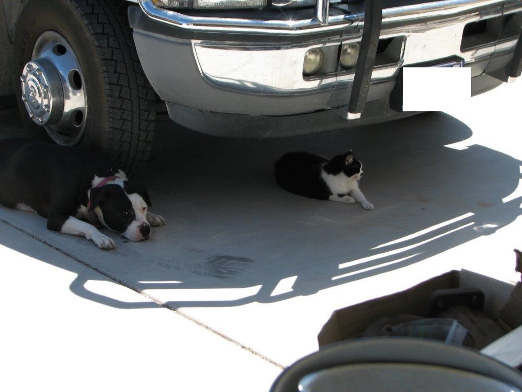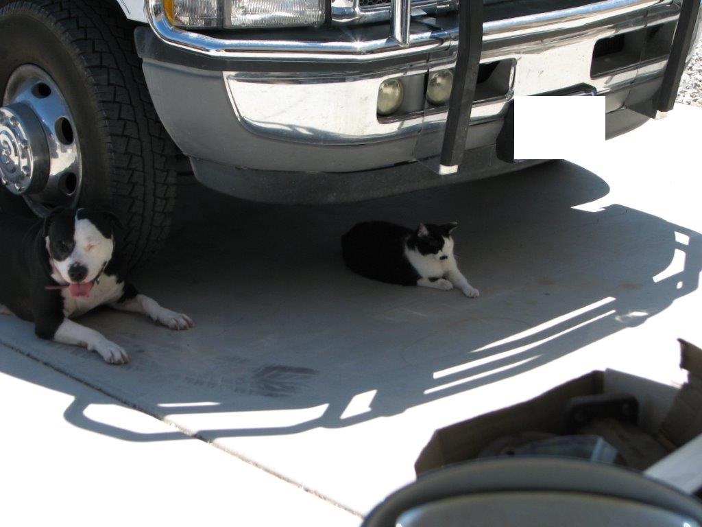 And this one showed up at our newest home and adopted us. She was about a year old when she took us in. One of those mean Pits or Staffordshires you hear about. The matching cat adopted us as well, with a litter of 6 we had to find homes for. As yu can see, she stayed around.