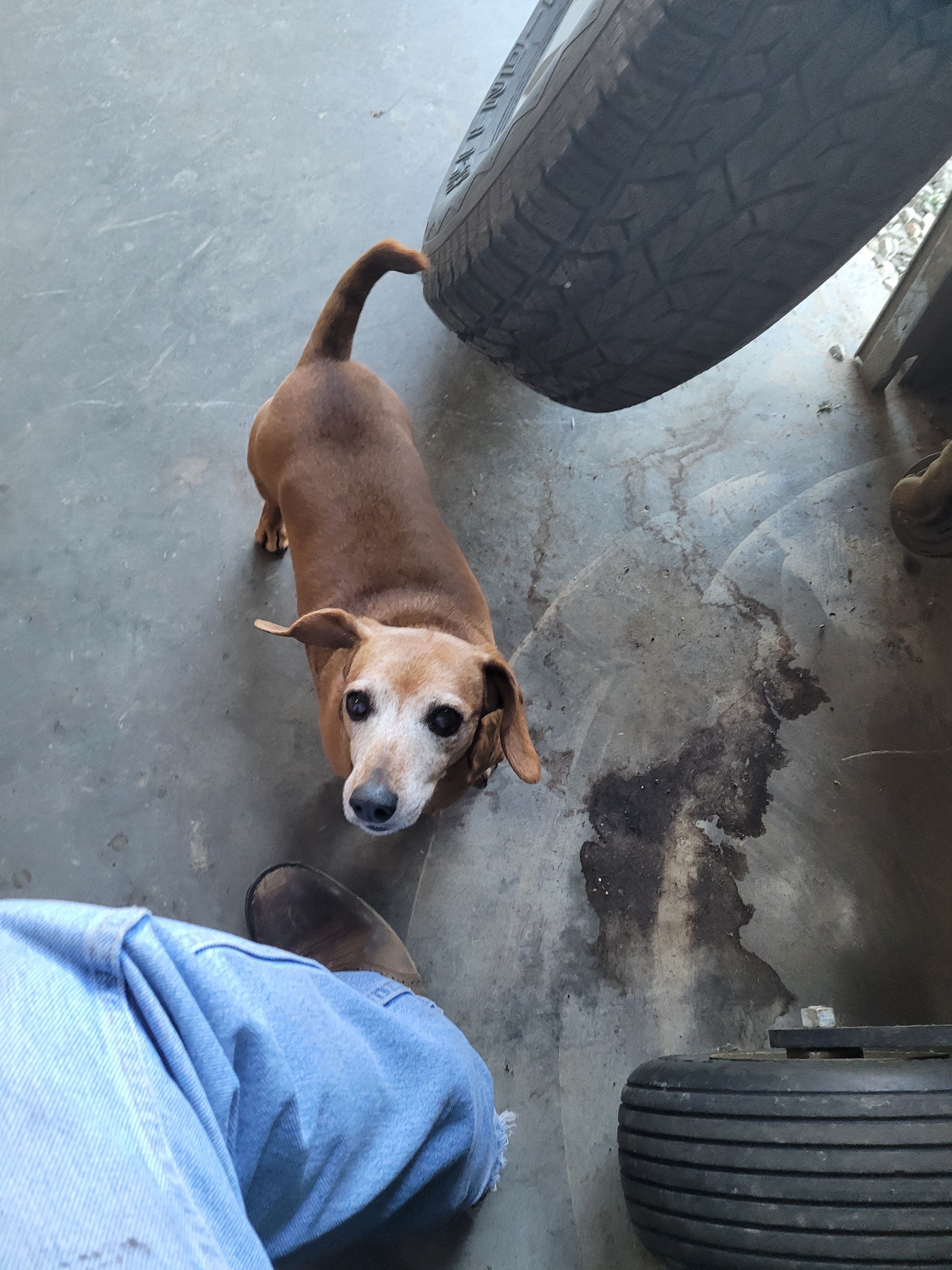 This is Penny, she belongs to Tommy my neighbor behind me. She comes over about 8 am everyday and usually stays until it gets dark. We make sure she has food and water when she's here, if I'd let her sleep in the house at night I don't think she'd go home.