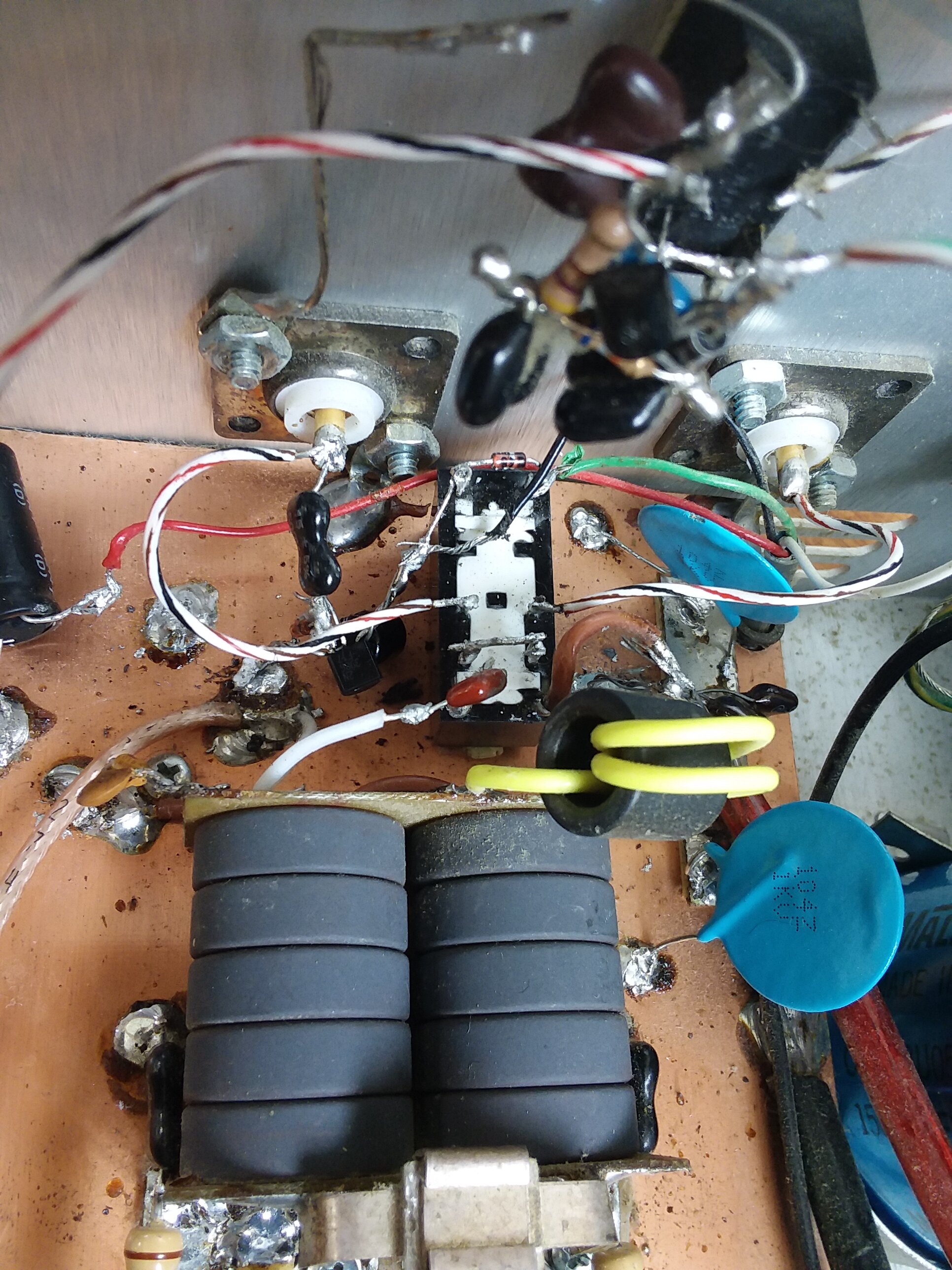 Hello all, I have searched, watched, and read as much info on this amp that is out there for weeks, and i am more confused than when I started. Quick story, I bought the amp as parts on order to steal the pills for a Texas star, that was a successful swap, it's initial problem as seen in 1st photo is that it burned the rf chokes off the relay..before pulling pills I used a 10uh Texas star choke across hot side of relay to bias terminal, immediately would sizzle when I turn the amp on..no rf..so i disconnected bias, preamp, output trans wire one at a time with the same results, so then I gave up and stole the pills. Since then I've rebuilt the key circuit, new relay, put a nice pair of hg's in there, I don't plan on hooking up the preamp...i also put a diode across the coil, it keys well...but where and what rf choke should I place across? What might blow the choke? The ab bias circuit maybe shorted somewhere? What should the bias cap at relay be in value? It has a .1 poly at moment, is that correct? Anyone out there with a clear pic of their black label base relay with this setup? I thank you all in advance for any input, 73's from 2 OP 095